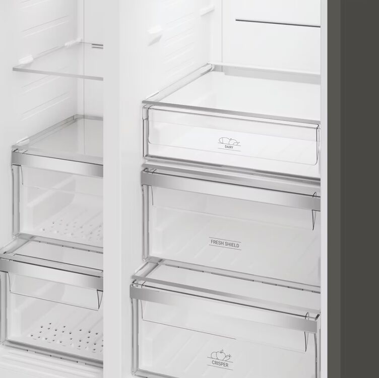 Dual No Frost technology is our best solution to keep your fridge and freezer frost-free. Two independent evaporators circulate air around both the fridge and freezer so ice and moisture can't build up, meaning you won't be left with the chore of defrosting your appliance ever again. Inside you'll find two specially designed FreshShield drawers which keep your fruit and vegetables fresh by circulating cool air slowly, maintaining the ideal temperature and humidity while preventing water droplets from forming.