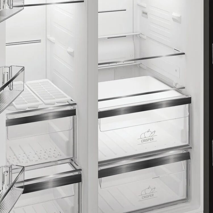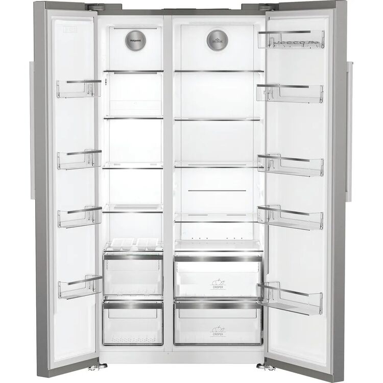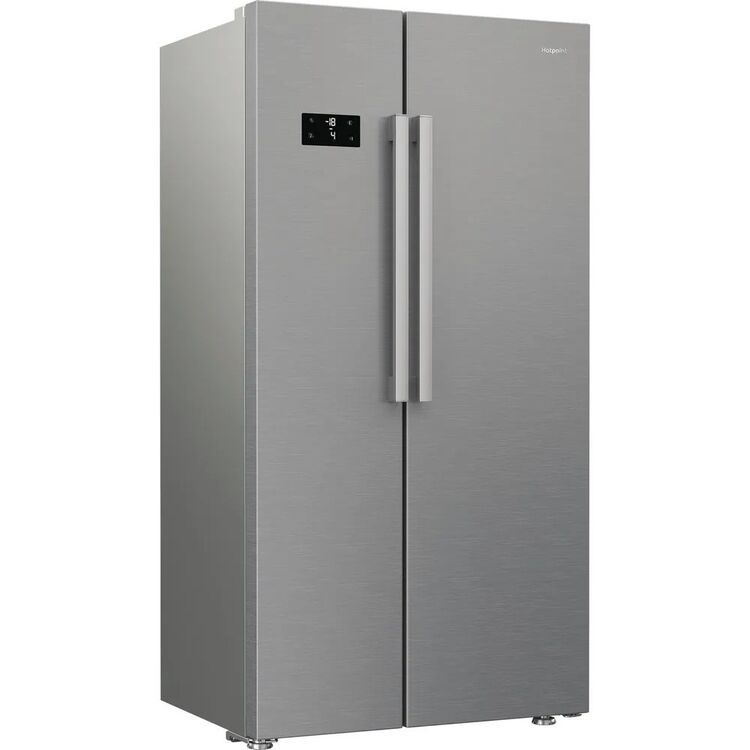 This super-stylish Hotpoint American fridge freezer is ready to stand-out in any kitchen and includes thoughtful technology that's focussed on keeping your food fresh and reducing waste. Available in silver, this fridge freezer has an extra-large capacity of 593L, providing ample space for 33 shopping bags worth of groceries - perfect for a large weekly shop and when your hosting friends and family. A sleek exterior display allows you to control temperature levels at the touch of a button and our Fast Freeze function quickly freezes food when you return home with groceries, intelligently dropping the temperature to help maintain the freshness of your food. Plus, with a built in water dispenser, you can quench your thirst with chilled water on demand. Dual No Frost technology will keep your fridge and freezer frost-free via two independent evaporators that circulate air to prevent ice and moisture build up, meaning you'll never need to spend time defrosting either compartment. Even Flow technology also gently distributes consistent, cool air across every shelf in the fridge, helping to maintain a stable temperature that preserves the taste and nutrients of your fruit and vegetables, while reducing weight loss. There's also our Fresh Shield drawer that slowly circulates cool air to maintain the ideal temperature and humidity levels while preventing water droplets from forming - keeping fruit and vegetables fresher for longer so that you and your family can enjoy nutritious meals and avoid food waste. Meanwhile, our quiet and durable Inverter Compressor immediately reacts to the door being opened, swiftly restoring a stable temperature to keep your food fresh and energy bills lower. Plus, adjustable shelves offer added flexibility to accommodate larger items effortlessly, while a bright LED light illuminates the interior so you can see everything clearly.