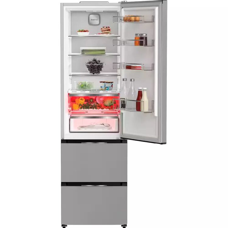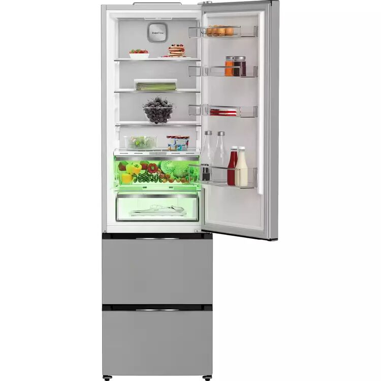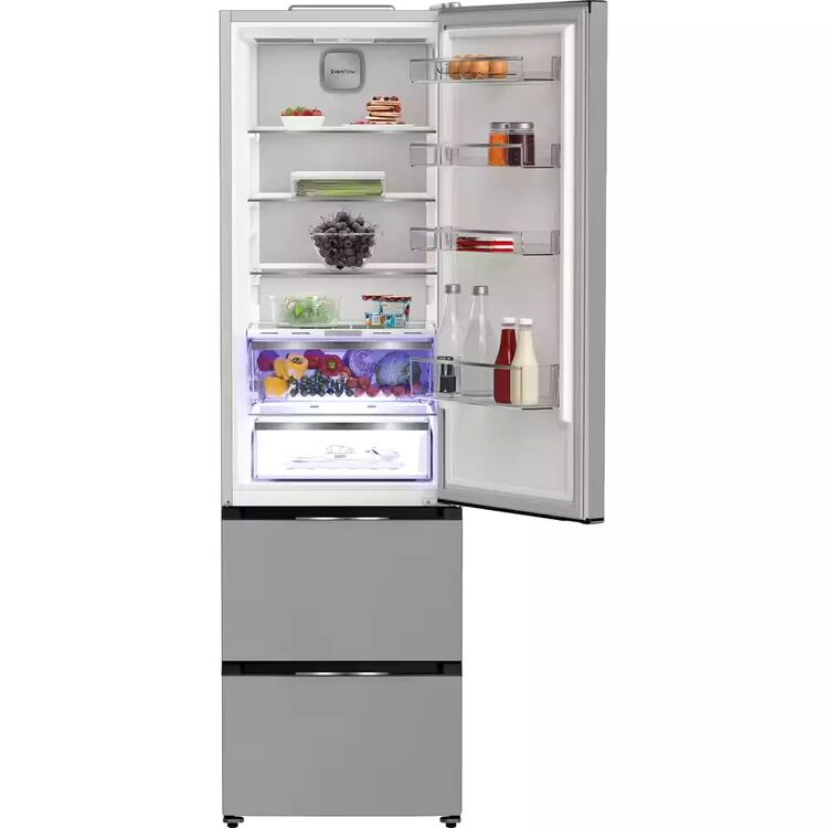 This super-stylish Hotpoint American 3-door fridge freezer, finished in brushed steel, is ready to stand out in any kitchen. With an extra-large capacity of 351L - enough for 20 shopping bags - it's perfect for fitting in a large weekly shop and when hosting friends and family. Thoughtful technology keeps food fresher for longer while helping cut down on waste. Dual No Frost ensures ice and moisture don°t build up in either the fridge or freezer, so you won°t need to manually defrost. And thanks to the quiet Inverter Compressor, the temperature stabilises quickly after every door opening ° helping to preserve food quality while using less energy. Inside the fridge, Even Flow cooling spreads air evenly across all shelves for consistent temperatures that keep ingredients crisp and tasty for up to 30% longer*. The dedicated VitalCare drawer makes use of gentle natural light to help fruit and veg stay fresher and full of nutritients for up to 7 days**. And the Fresh Shield compartment also ensures fresh food gets just the right amount of cooling and humidity to stay in perfect condition for longer***. With a Fast Freeze function for your new groceries and 90° door hinges that make it easy to install in tighter spots, this appliance fits around your kitchen ° and your life. *Weight loss and sensory evaluation tests used for the determination of shelf life were conducted internally by Beko Corporate on carrot, fresh-cut iceberg lettuce, fresh-cut tomato, strawberry, salami, and kashar cheese samples stored in the EvenFlow refrigerator and control refrigerator (without the EvenFlow technology) for a 12-day period. Actual results may vary based on food type and usage conditions. **Tested by Intertek for fruits and vegetables (blueberry, yellow pepper, tomato, parsley) directly exposed to the light technology compared to a refrigerator without the same technology installed (and compared to Day 0) over a 7-day period while preserved in the crisper. ***According to internal tests conducted by Beko Corporate on fresh lettuce, ProFresh crisper technology can preserve freshness longer compared to standard crisper based on the K70561 cabinet.