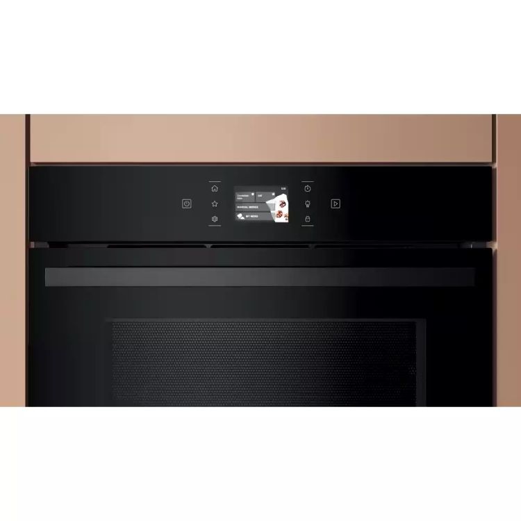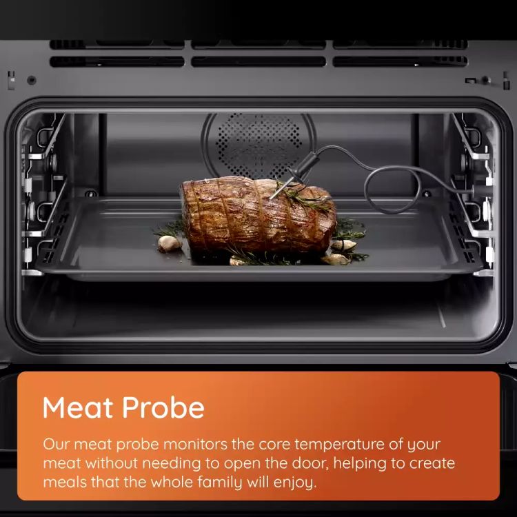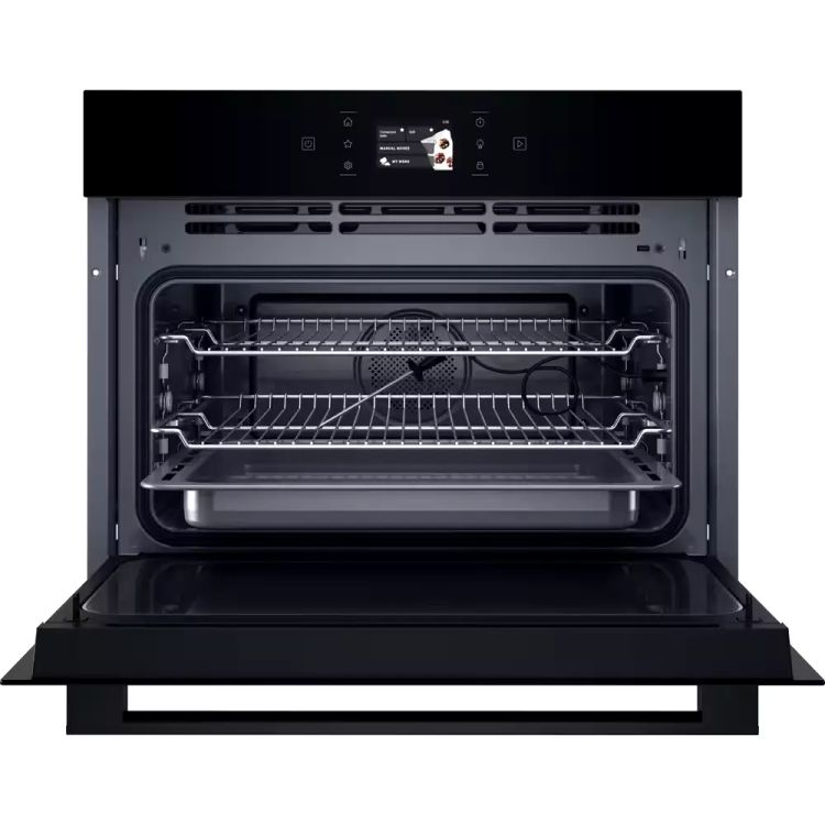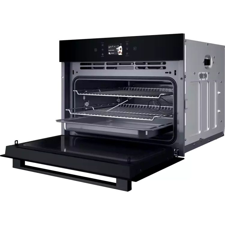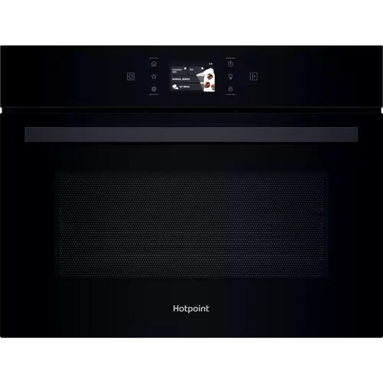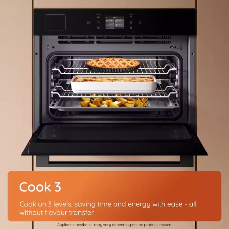 Maximise your kitchen space with this Hotpoint 45cm Class 8 compact oven, expertly crafted for versatility and energy efficiency. With a glossy black finish, elegant black metallic accents and an intuitive high-resolution full-colour touchscreen display for precise control, it seamlessly blends cutting-edge technology with minimalistic design to elevate your cooking experience. Offering a 950W microwave and 8 cooking functions, this space-saving oven is perfect for reheating, steaming, baking, grilling, and crisping - delivering exceptional performance and convenience for flawless meals every time. Thanks to Cook 3 technology, the spacious 53L cavity is our first to feature 3 levels so you can cook a complete family meal all at once without any flavour transfer, saving up to 43% in energy and 61% in time*. Streamline your workspace with the integrated crisping functions. Choose Dynamic CrispFry for healthier, air-fried results on a wide variety of fresh and frozen food, from french fries to fried chicken, while using up to 50%** less fat. Or select Dynamic Crisp for deliciously golden oven-baked crispiness at the speed of a microwave, so you can cook foods like pizza, halloumi and even a full English breakfast in record time.