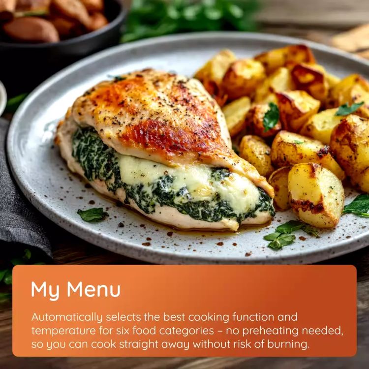 For those who seek healthier, flavour-rich meals, Gentle Steam technology locks in moisture and nutrients. Simply add water to the dedicated recess and choose from 3 steam settings, ideal for perfecting bread, fish, and succulent meats. Cooking has never been so effortless. MyMenu automatically selects the optimal settings for a range of different dishes, making it your perfect kitchen assistant when preparing meals. For the ultimate in oven cleaning convenience, Hotpoint has you covered. The quick and eco-friendly Diamond Clean cycle uses the power of steam to soften hardened residue so it can be wiped away, giving you more time to spend with your family. And for a final touch of luxury, the soft-closing door enhances the oven°s premium feel. *Comparing cooking tart, lasagna, chicken drums with roasted potatoes on 3 levels simultaneously vs cooking same dishes in 3 separate runs. **Comparison between frozen french fries cooked with Dynamic Crisp Fry function without oil addition vs deep oil frying methods (Deep Fryer SDA or Pan Frying). Different results obtained with Dynamic Crisp Fry feature depending on the kind of food and oil addition.