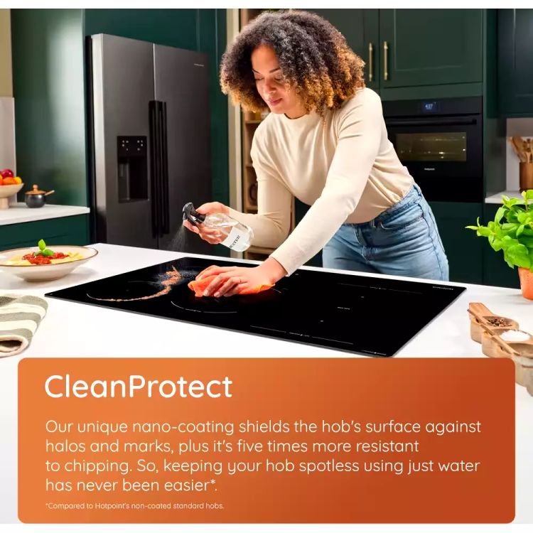 The unique CleanProtect nano-coating shields the hob's surface from halos, marks and chips, making it super easy to keep spotless using just water*.