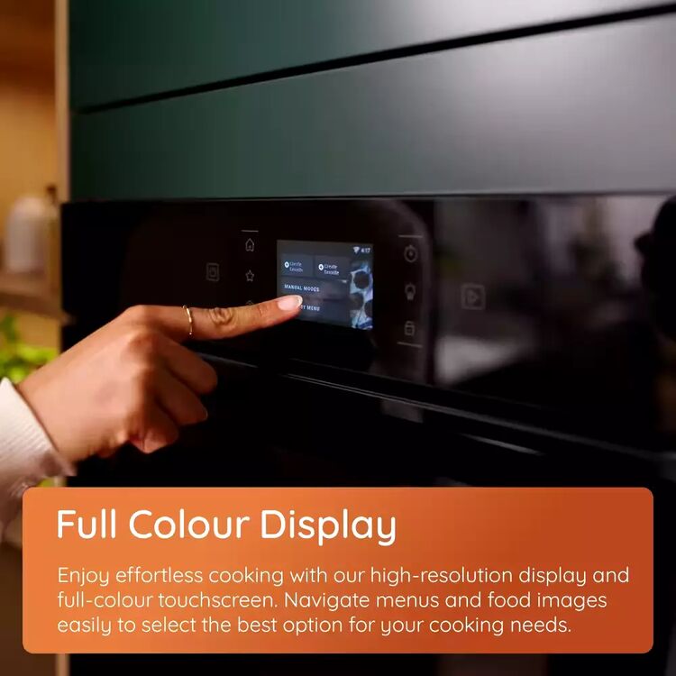 Expertly crafted for those who appreciate both style and performance, this Hotpoint Class 8 oven seamlessly blends cutting-edge technology with minimalistic design to elevate your cooking experience while perfectly complementing any kitchen. Featuring a glossy black finish with elegant black metallic accents and an intuitive high-resolution full-colour touchscreen display for precise control, this oven offers 8 versatile cooking functions to empower you to achieve flawless meals every time.