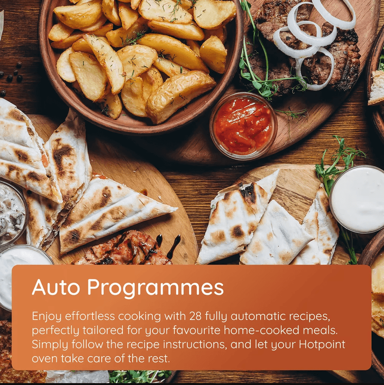 Thanks to Multiflow technology, heat is evenly distributed throughout the spacious 71L cavity so you can cook a complete family meal on 3 levels simultaneously without any flavour transfer, saving you both energy and time*. For a crisp, golden finish, the Turbo Grill combines grilling with enhanced heat circulation, ensuring even cooking and flawless results. Enjoy effortless cooking with 28 automatic recipes for your favourite home-cooked meals. Simply follow the recipe instructions and your oven takes care of the rest.