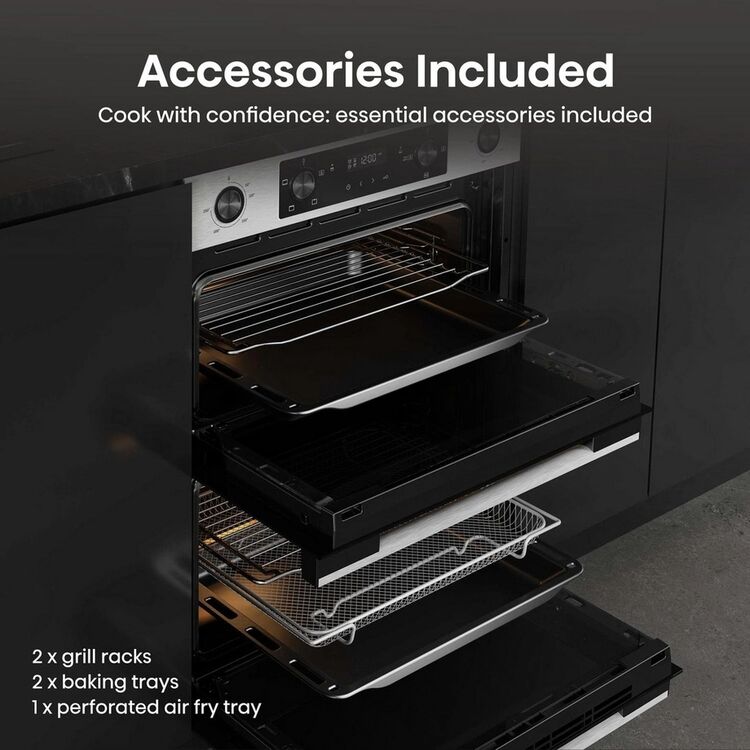 Discover the Hisense BUD714221CX, a built-under electric double oven featuring dual cavities with a total capacity of 92 litres—38 litres in the upper and 54 litres in the lower compartment. This model utilises a main electric fan oven to ensure uniform cooking throughout each shelf, eliminating hot spots for perfectly prepared meals. Its integrated airfry function, equipped with a perforated tray, offers a healthier alternative to frying, making it an excellent addition for health-conscious users seeking versatility in the kitchen.