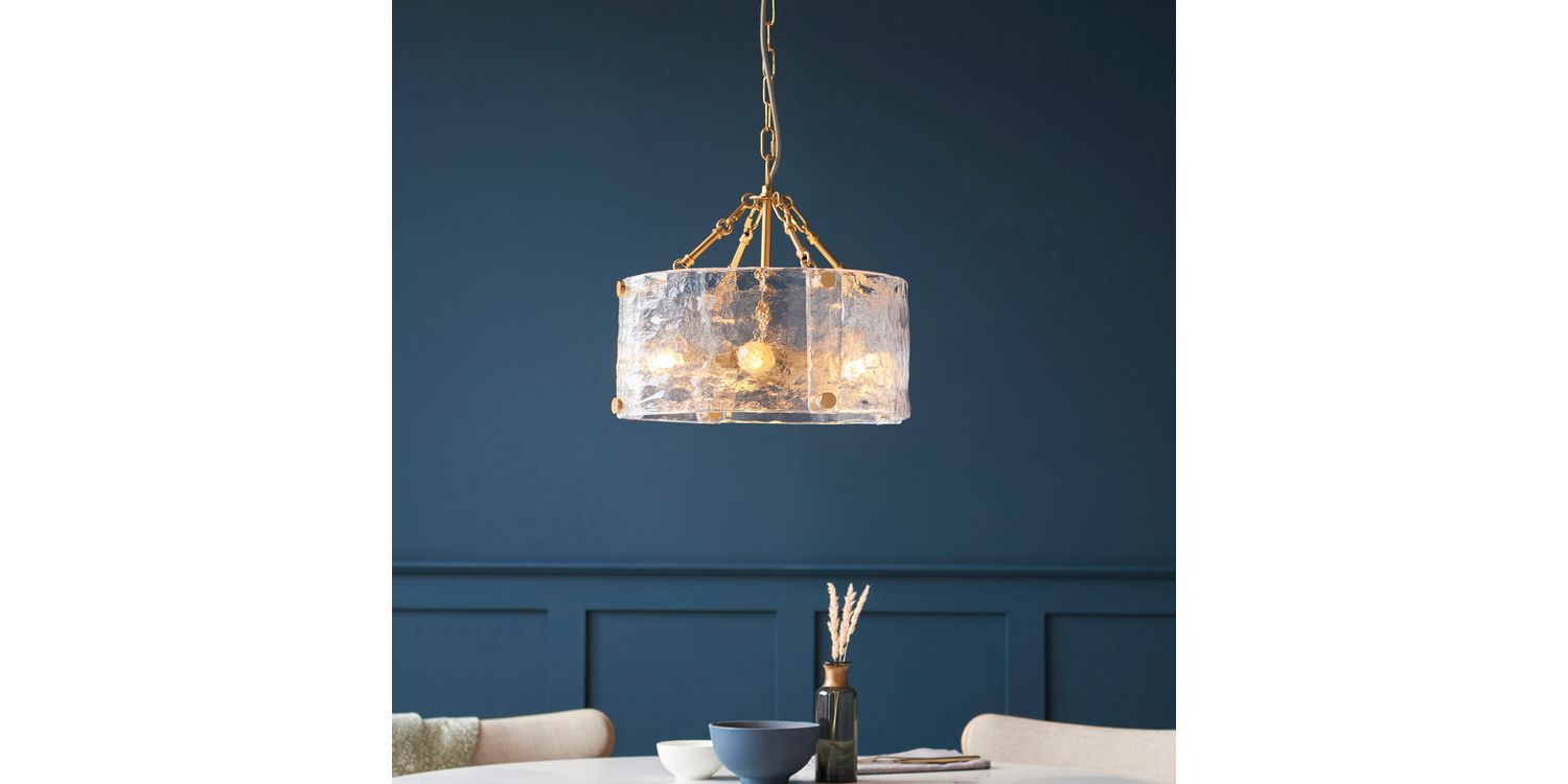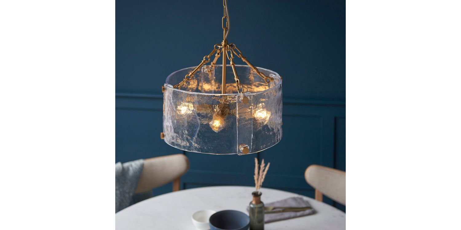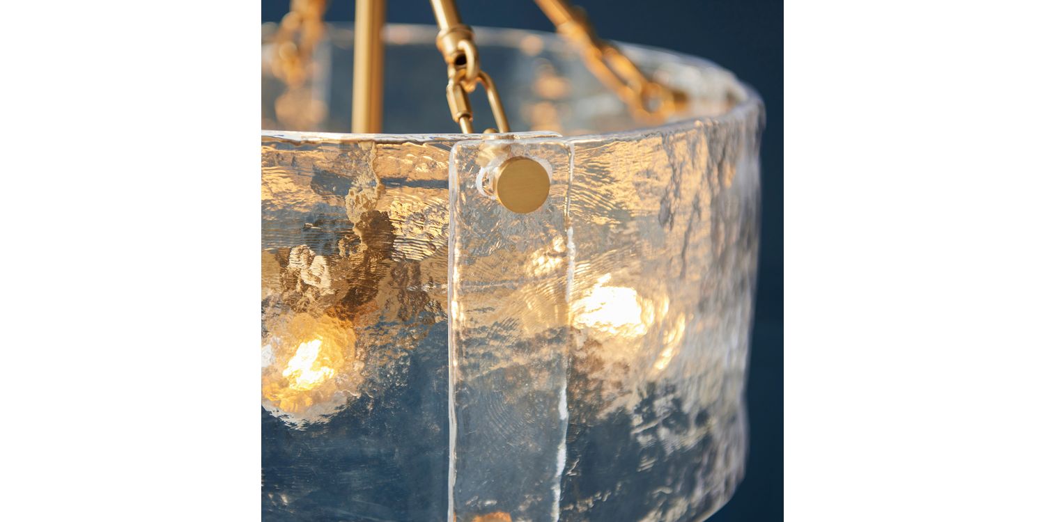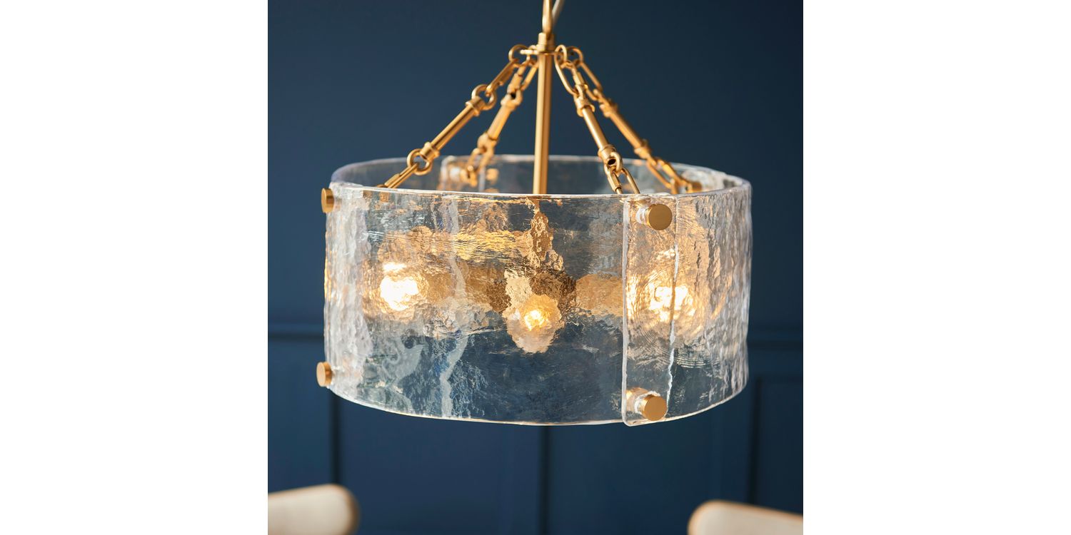 Sculptural and unique this 4-light pendant features a cylindrical shade formed from thick, handmade glass panels that showcase organic texture and artisanal character. The warm metallic frame and decorative fixings add a handmade touch, while the height-adjustable chain and grey braided fabric flex offer versatility in installation. Ideal for dining rooms, hallways, or living areas, it delivers a soft, ambient glow with a crafted presence.
