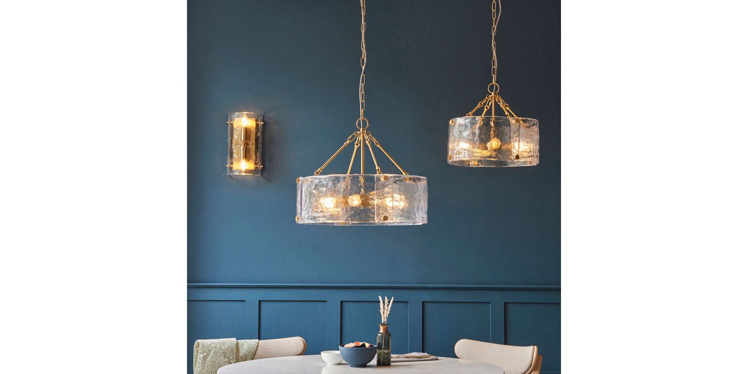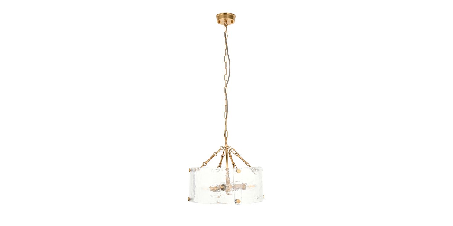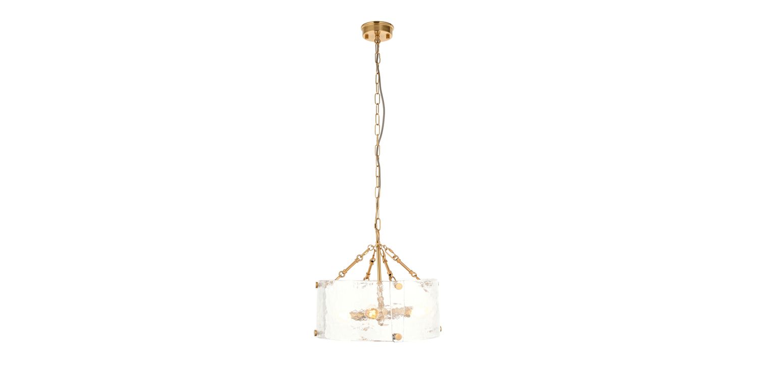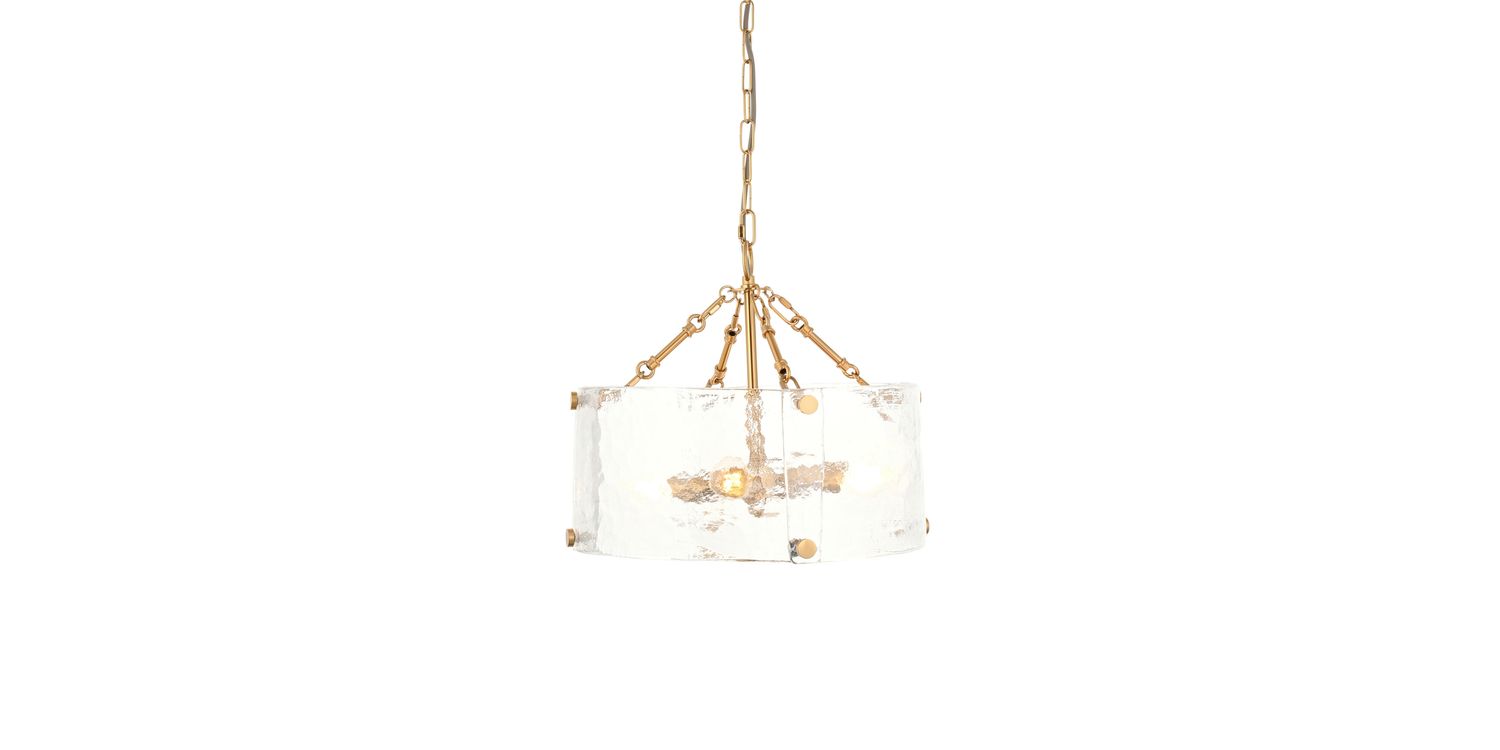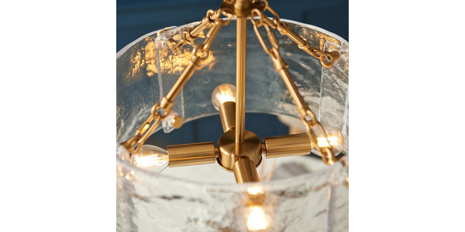 Sculptural and unique this 4-light pendant features a cylindrical shade formed from thick, handmade glass panels that showcase organic texture and artisanal character. The warm metallic frame and decorative fixings add a handmade touch, while the height-adjustable chain and grey braided fabric flex offer versatility in installation. Ideal for dining rooms, hallways, or living areas, it delivers a soft, ambient glow with a crafted presence.
