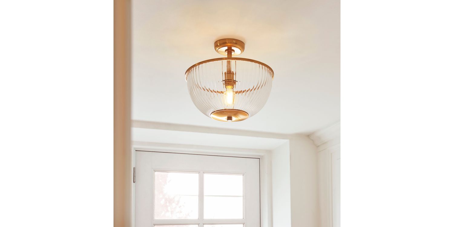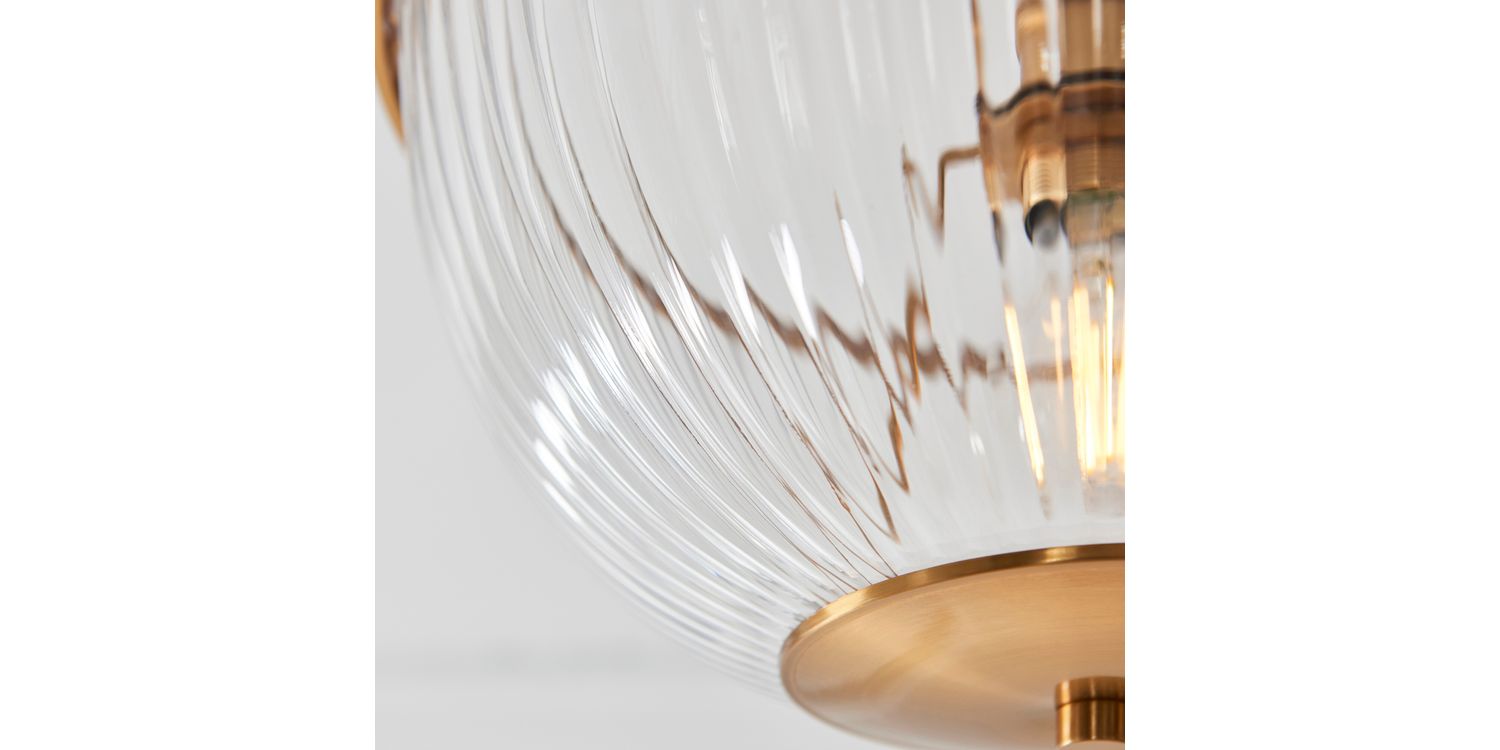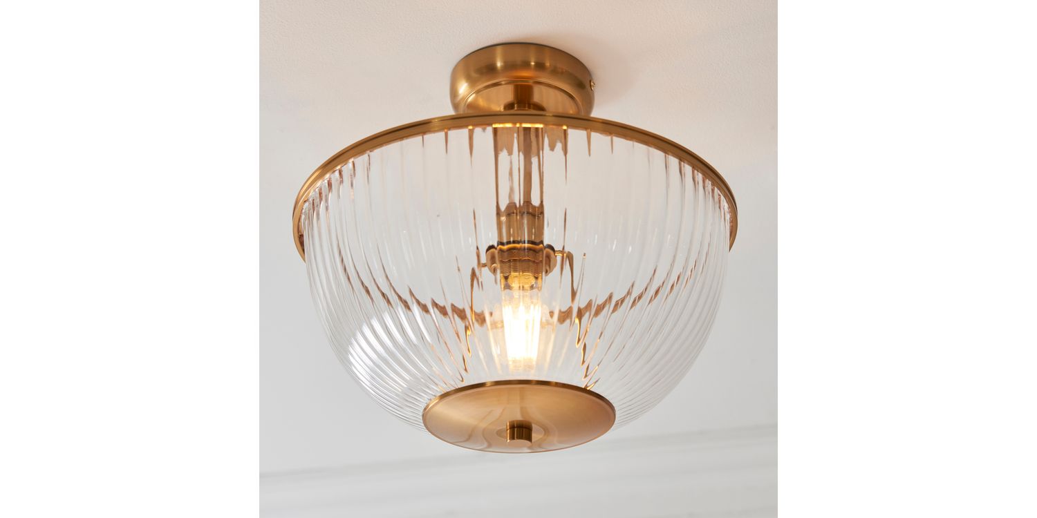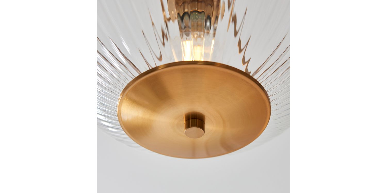 This refined E27 flush light pairs timeless elegance with understated design. Featuring a ribbed clear glass bowl shade with classic shaped banding in warm brass, it casts a diffused glow ideal for lower ceilings or compact spaces. Perfect for hallways, bedrooms, or living areas, its sleek flush fitting provides a clean, tailored look while adding a touch of classic sophistication to your home.