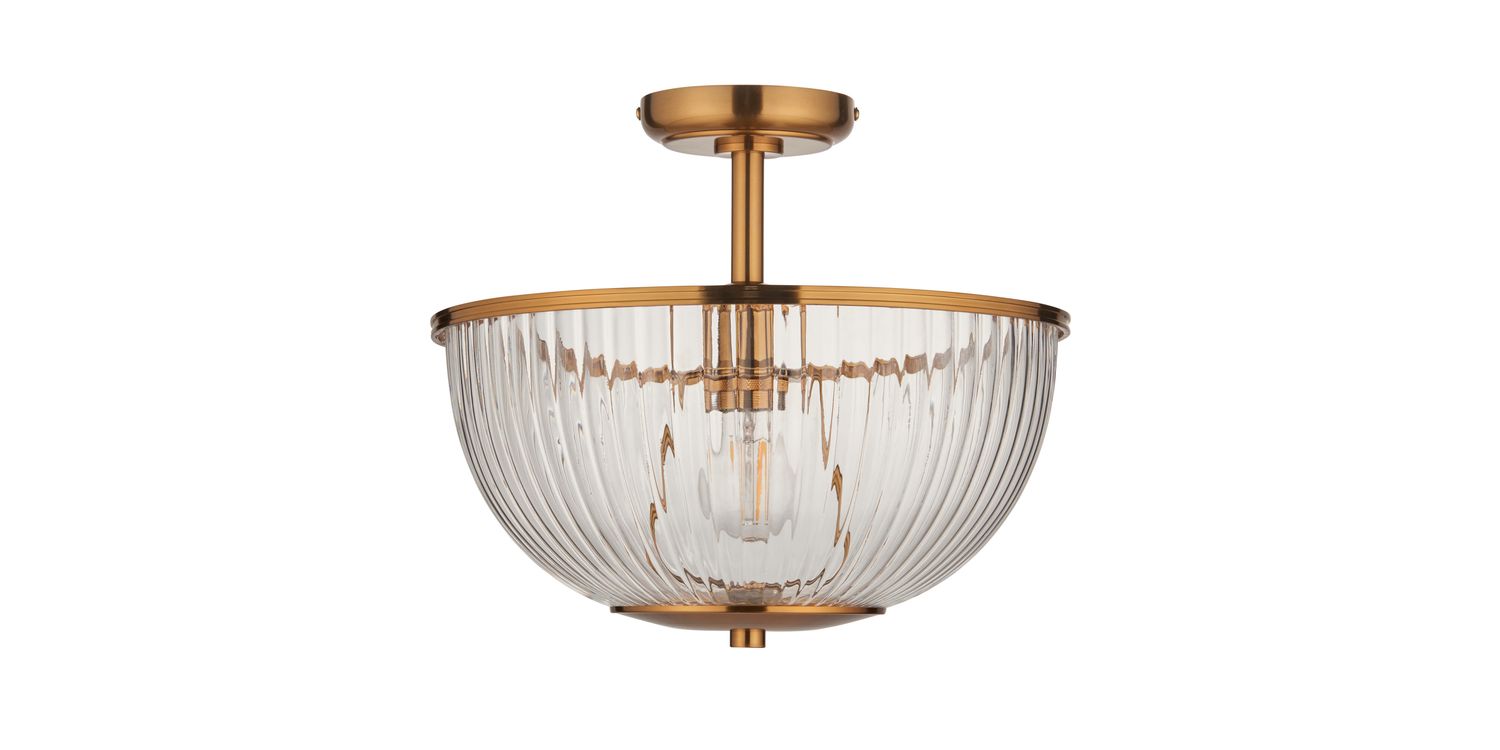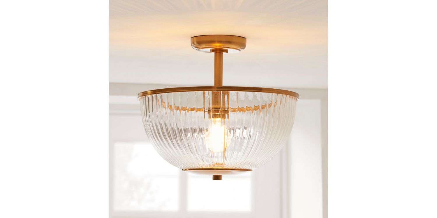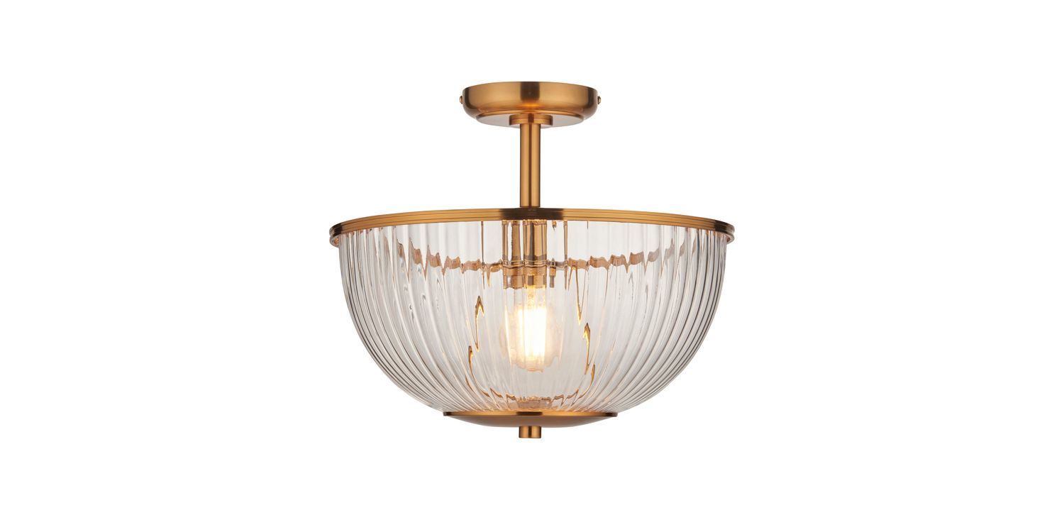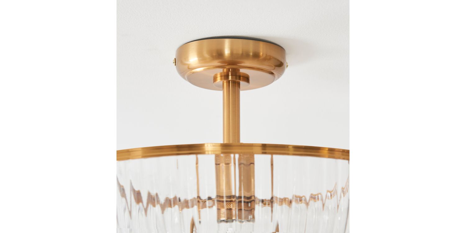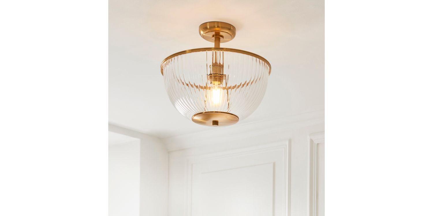 This refined E27 flush light pairs timeless elegance with understated design. Featuring a ribbed clear glass bowl shade with classic shaped banding in warm brass, it casts a diffused glow ideal for lower ceilings or compact spaces. Perfect for hallways, bedrooms, or living areas, its sleek flush fitting provides a clean, tailored look while adding a touch of classic sophistication to your home.