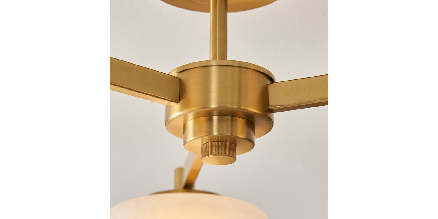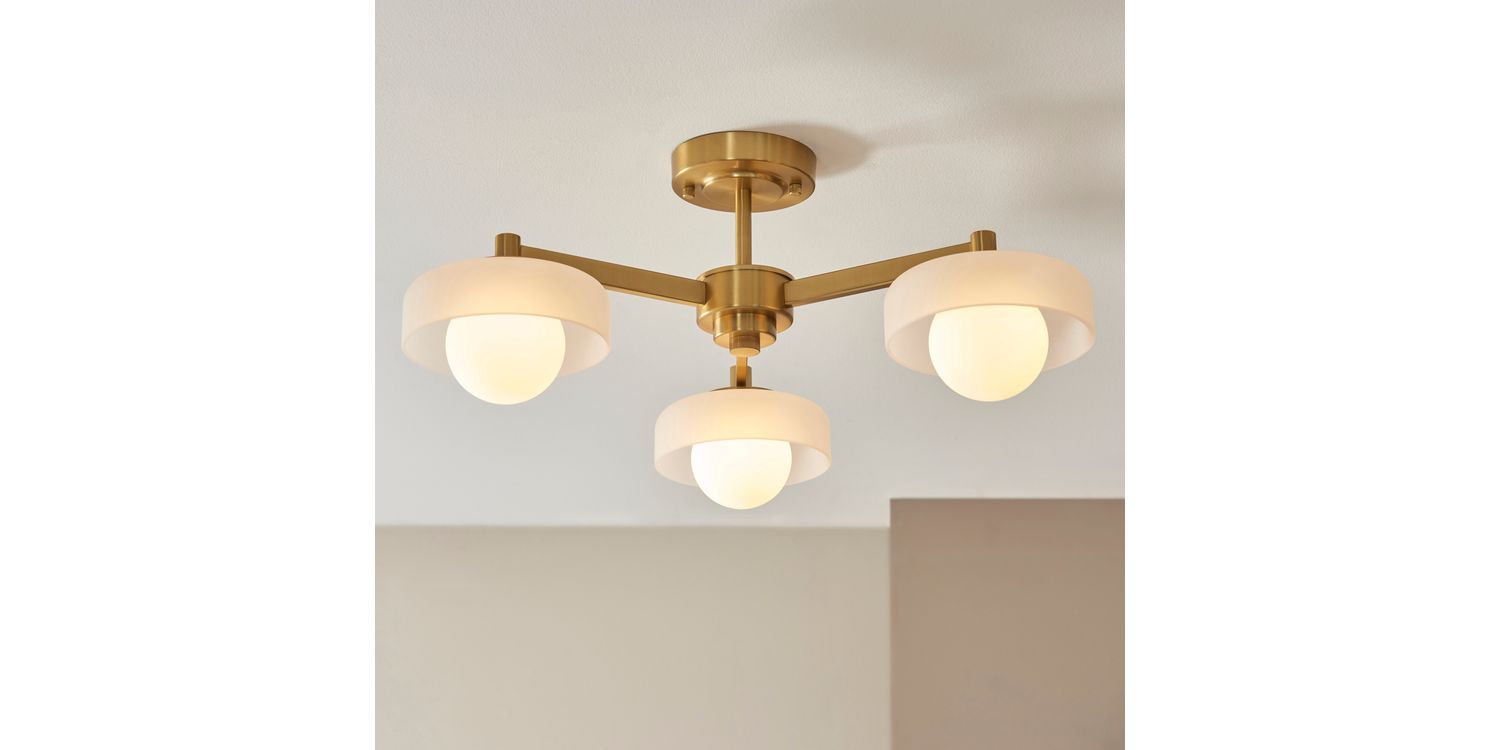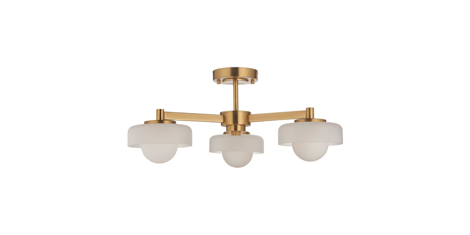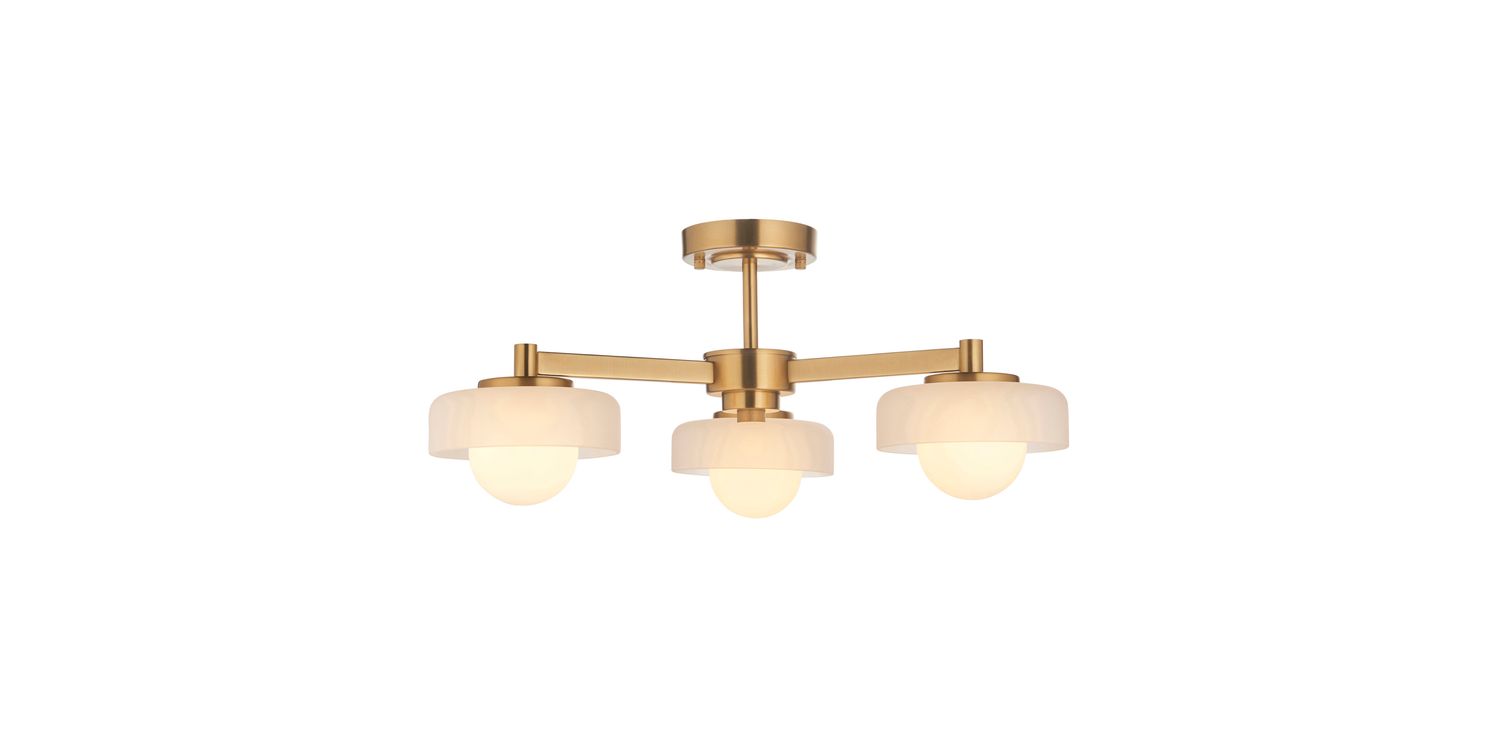 With a refined mid-century aesthetic, this 3-light semi-flush ceiling light features frosted outer glass shades enveloping opal glass spheres for a beautifully diffused glow. The brushed aged brass metal frame adds warmth and sophistication, while the clean lines and geometric form offer a sleek, modern profile. Perfect for living rooms, dining areas, or hallways, it delivers statement-making style with soft, ambient lighting.