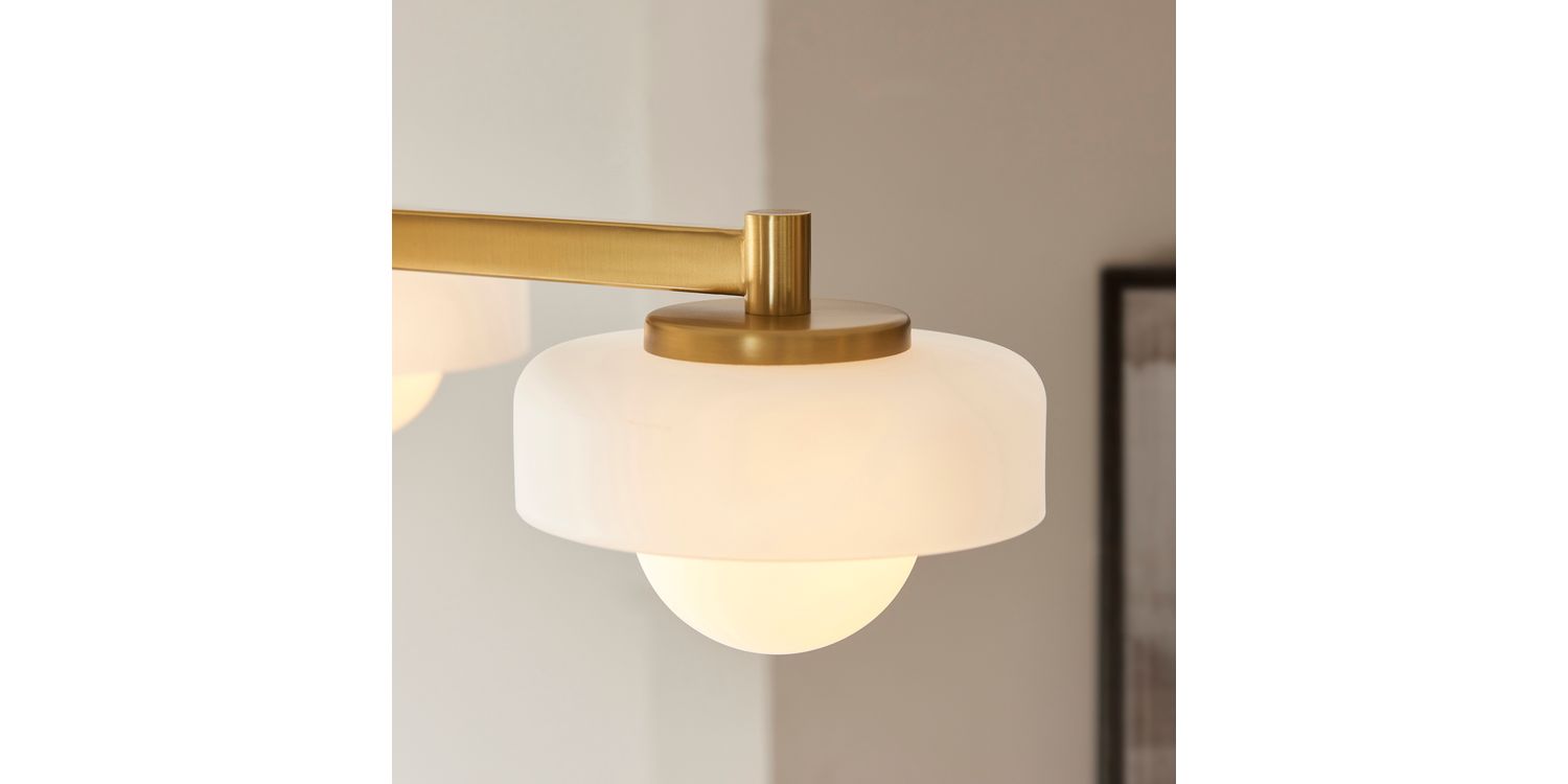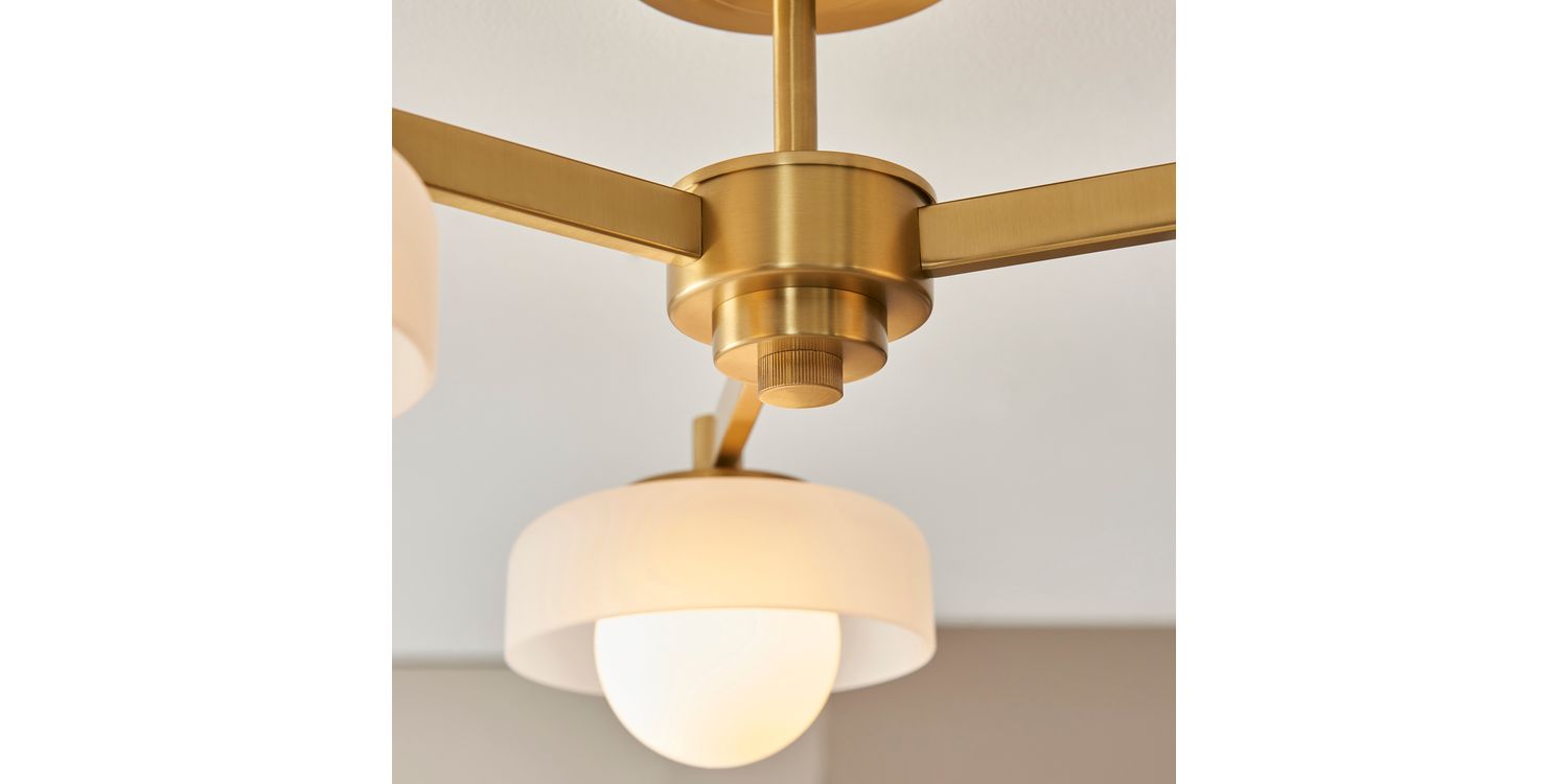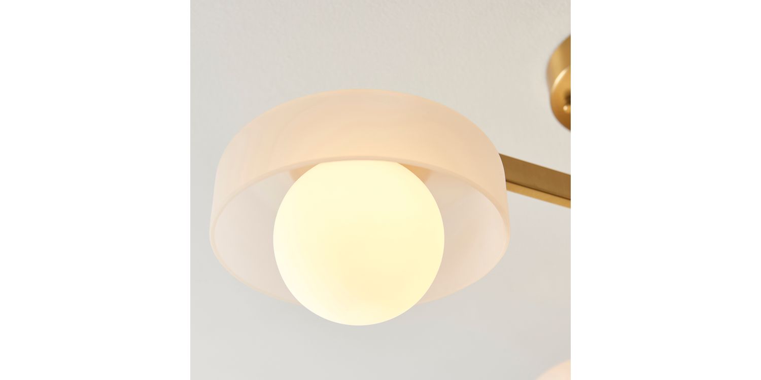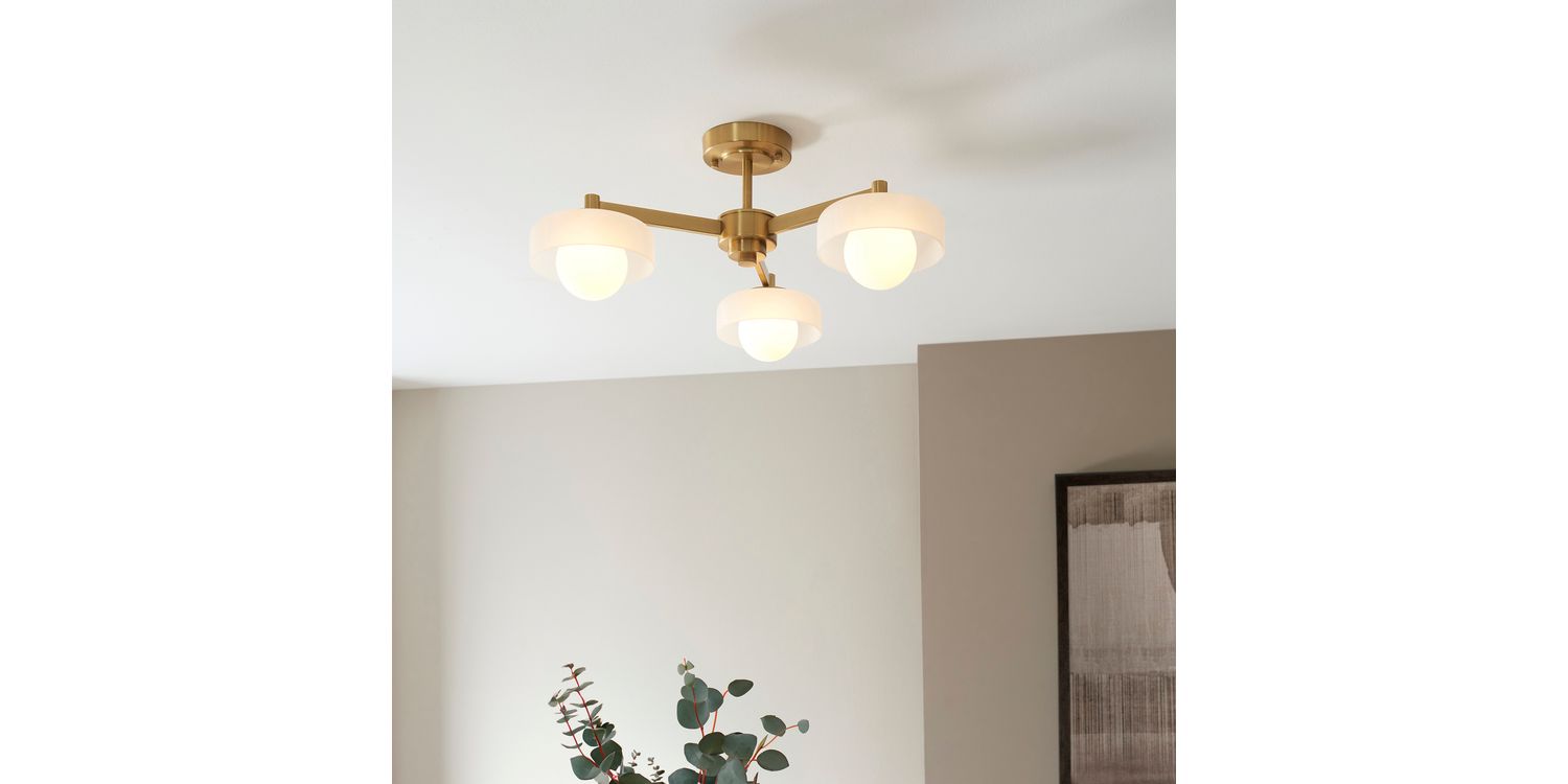 With a refined mid-century aesthetic, this 3-light semi-flush ceiling light features frosted outer glass shades enveloping opal glass spheres for a beautifully diffused glow. The brushed aged brass metal frame adds warmth and sophistication, while the clean lines and geometric form offer a sleek, modern profile. Perfect for living rooms, dining areas, or hallways, it delivers statement-making style with soft, ambient lighting.