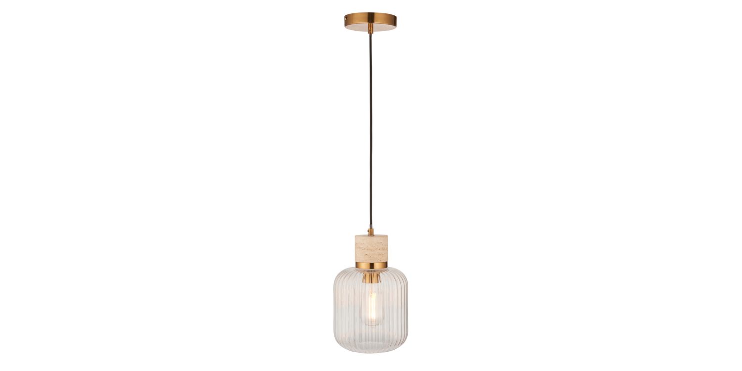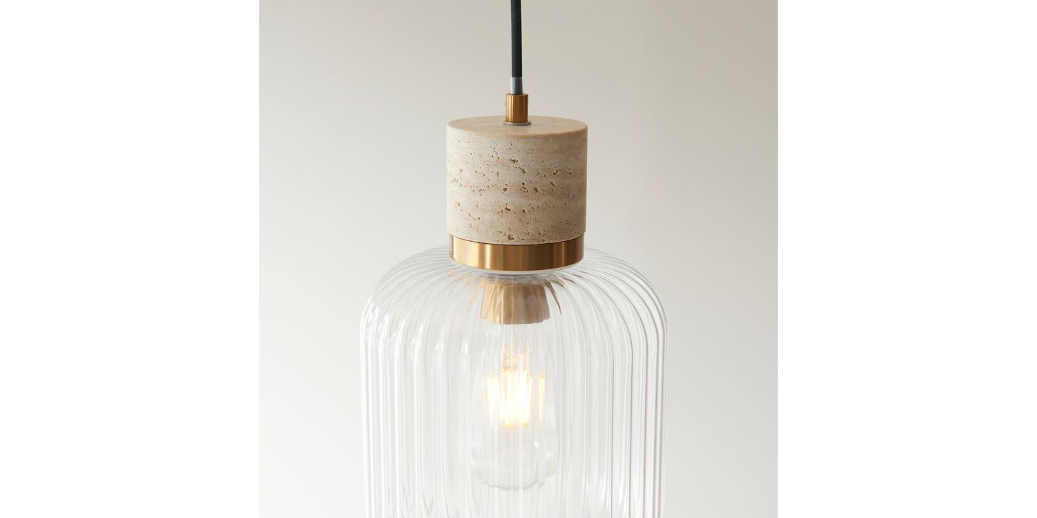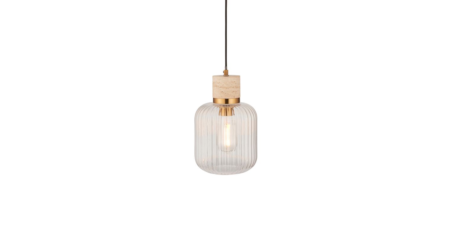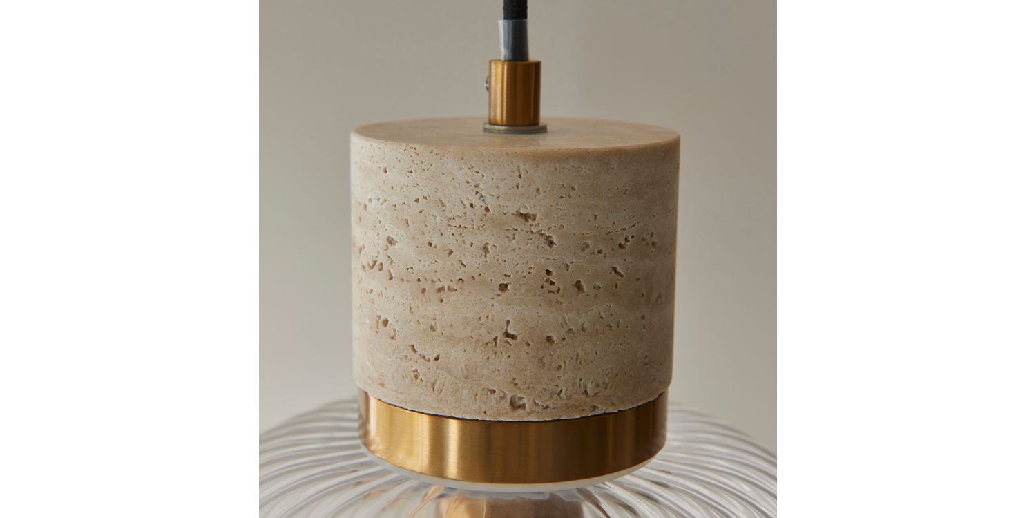 Elevate your interiors with this effortlessly stylish single pendant light, combining natural textures with sleek metallic accents. A smooth travertine stone top pairs beautifully with a warm brass collar, suspending a softly rounded clear ribbed glass shade that showcases the bulb within. Hung from a matching brass ceiling rose with a slim black fabric flex, this pendant makes a striking feature over kitchen islands, dining tables, or in contemporary living spaces. Understated yet elegant, it offers a perfect balance of modern refinement and organic warmth.