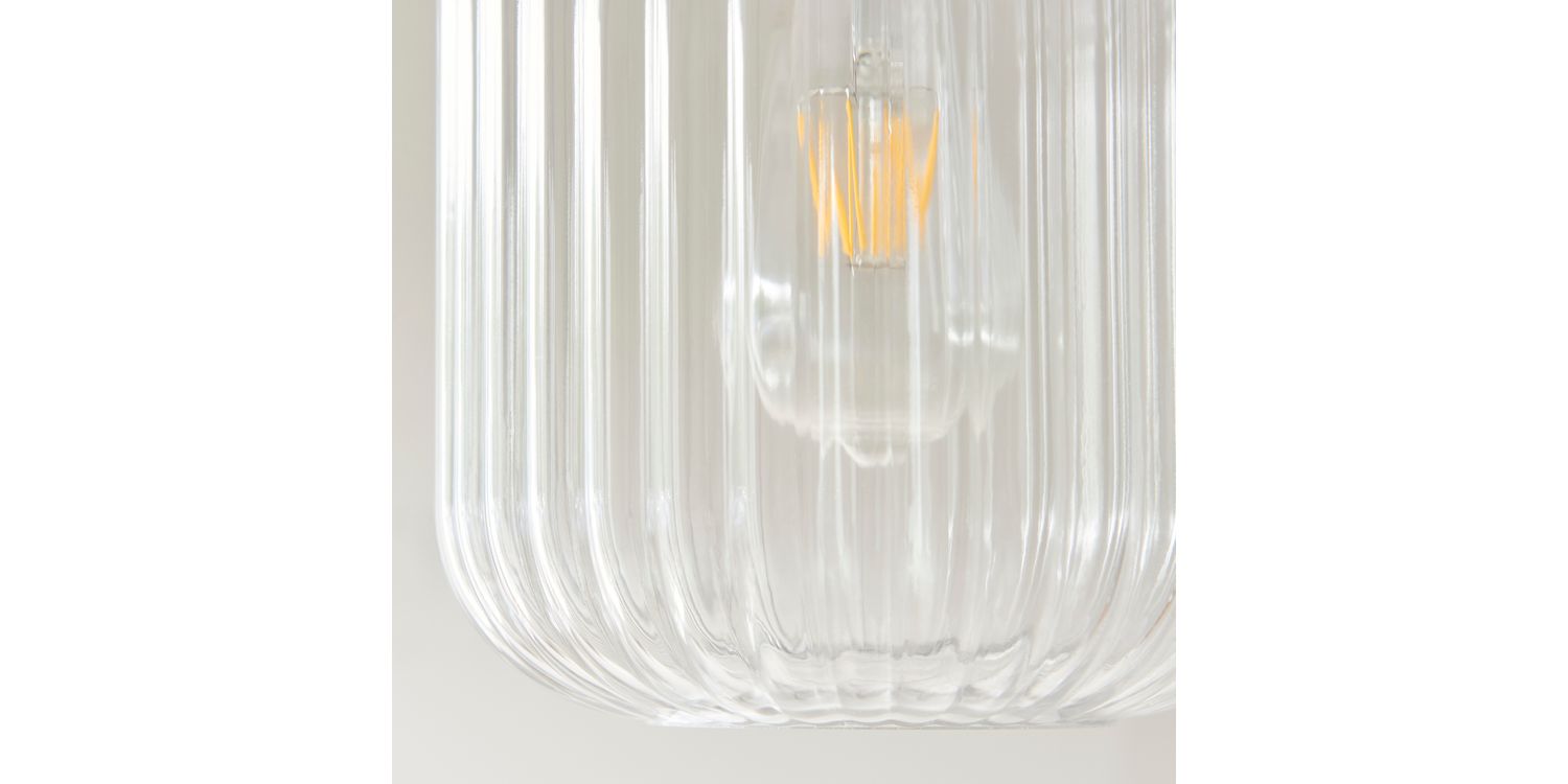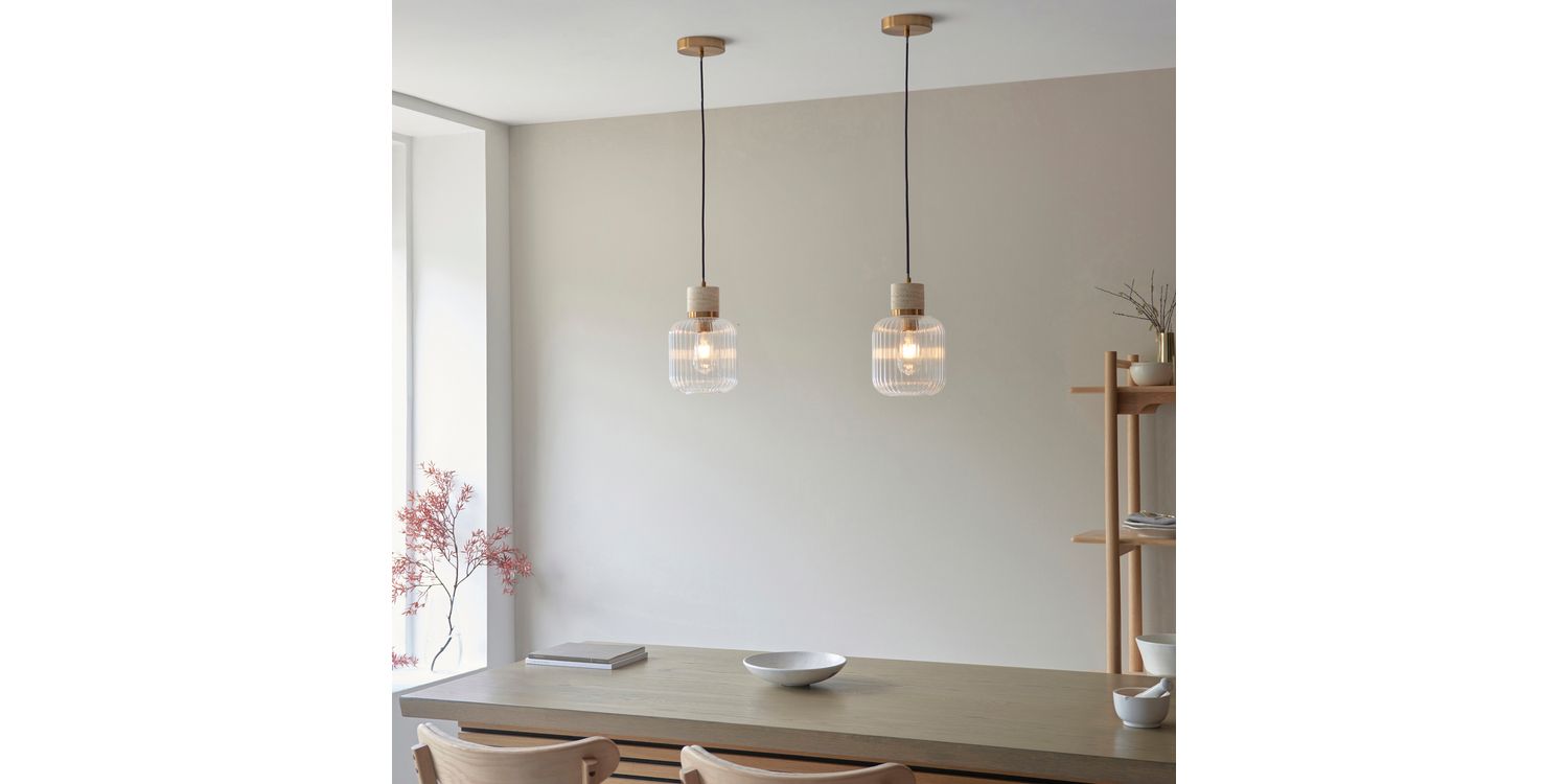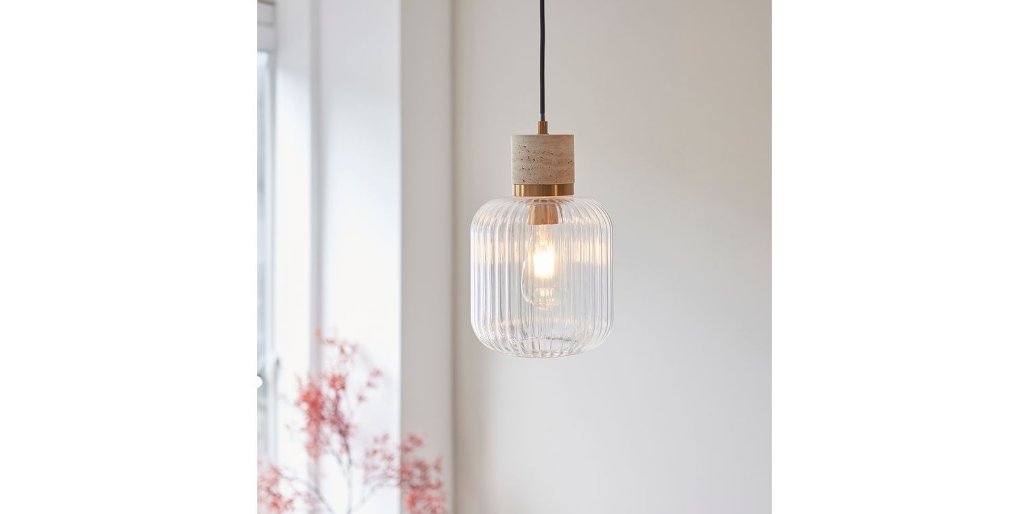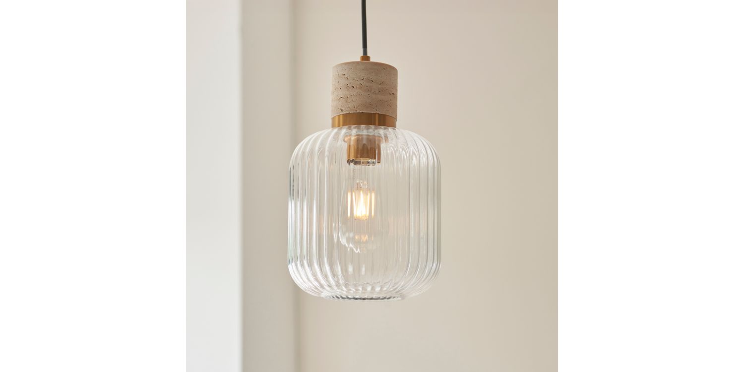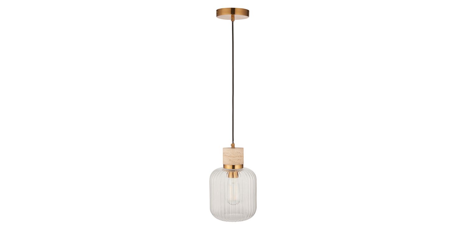 Elevate your interiors with this effortlessly stylish single pendant light, combining natural textures with sleek metallic accents. A smooth travertine stone top pairs beautifully with a warm brass collar, suspending a softly rounded clear ribbed glass shade that showcases the bulb within. Hung from a matching brass ceiling rose with a slim black fabric flex, this pendant makes a striking feature over kitchen islands, dining tables, or in contemporary living spaces. Understated yet elegant, it offers a perfect balance of modern refinement and organic warmth.