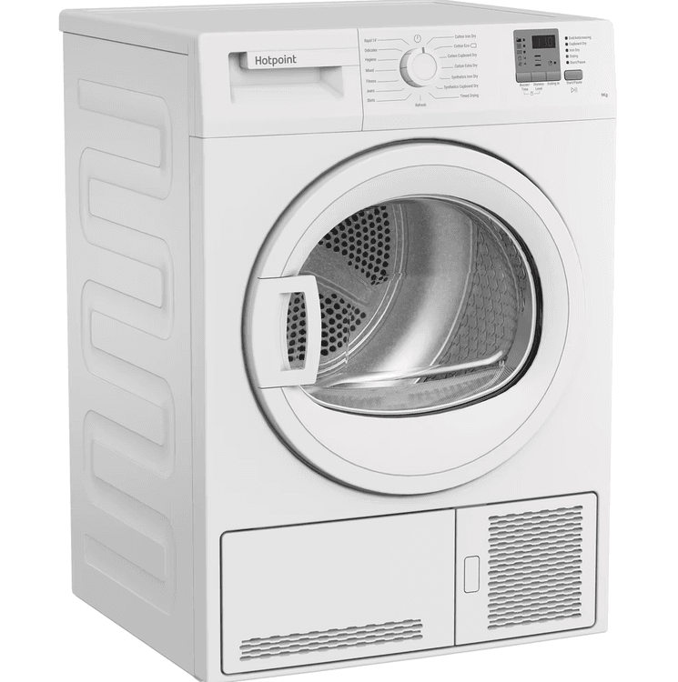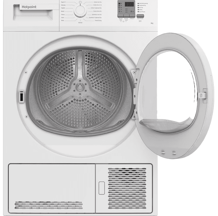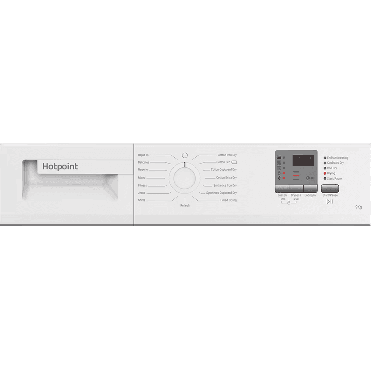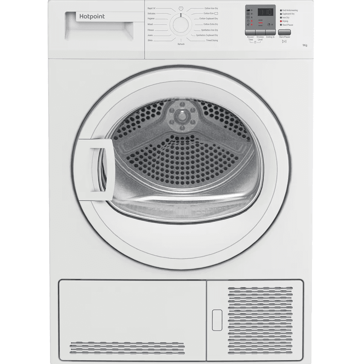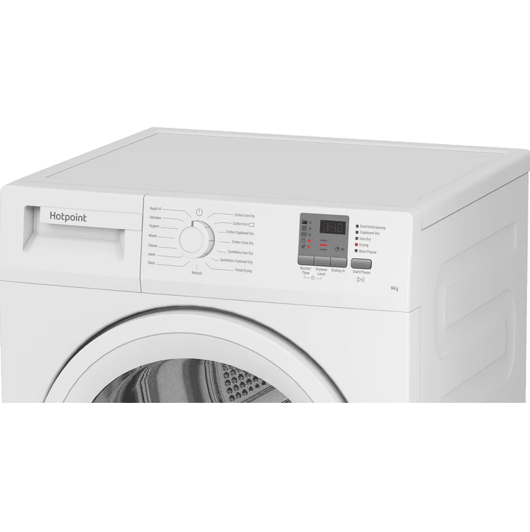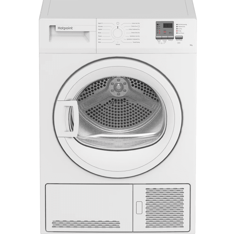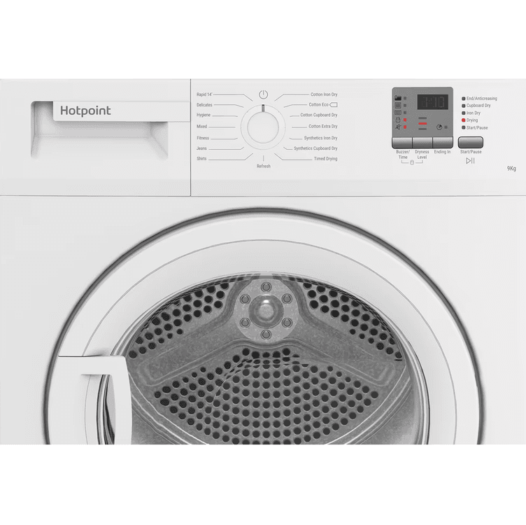 Hotpoint 9KG Condenser Dryer in White, Energy Rating B. Features a digital time display and a single dial for easy selection of 15 drying cycles, including a quick 14-minute express cycle, refresh cycle and timed drying options. Comes with a transparent door for easy monitoring.