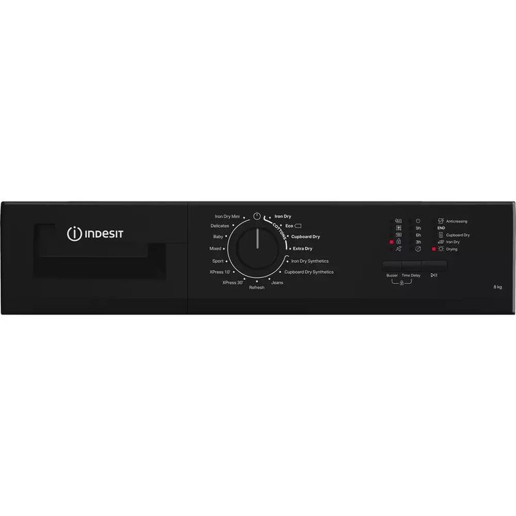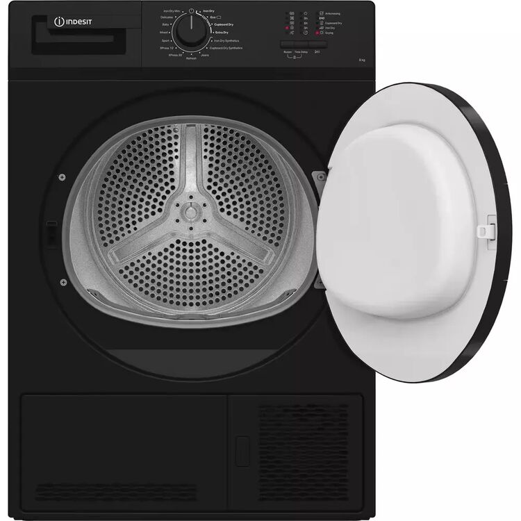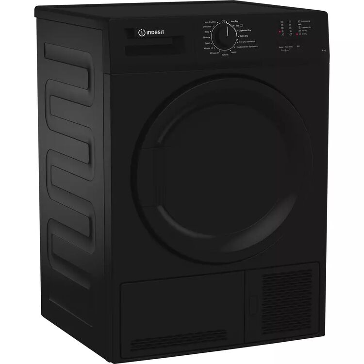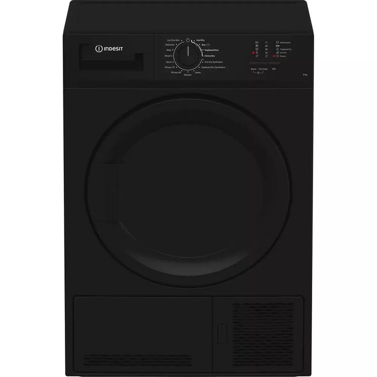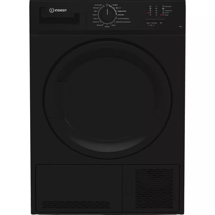 Indesit 8KG Condenser Dryer in Black, Energy Rating B. Comes with LED marker display and single control knob for selecting one of 15 cycles including 2 XPress cycles of 10 or 30 minutes and an easy iron option.
