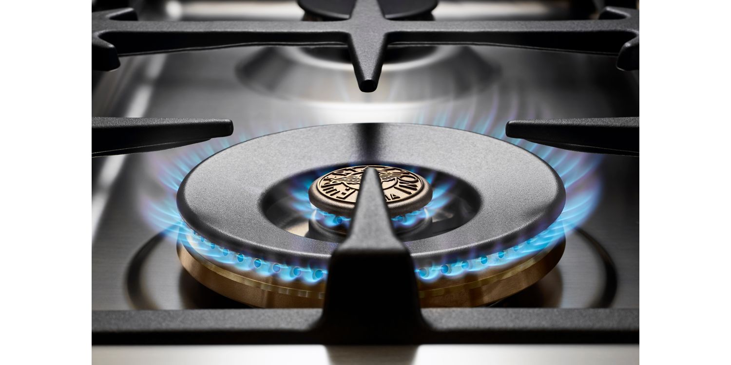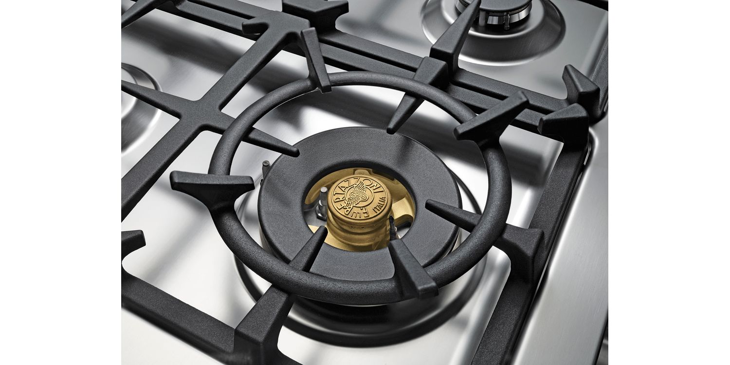 The hob has a stainless steel electric teppan-yaki griddle and six versatile gas burners in brass including a dual-ring power burner.