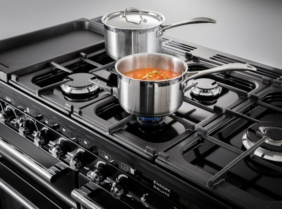 Sleek, straight-lined and contemporary, the Encore Deluxe design is available in a wide selection of sizes, fuels and colours to complement or contrast any kitchen scheme. The dual fuel and induction models feature large square viewing windows, linear handles and sturdy control dials. Choose from a classic Ivory, Black or Stainless-Steel finish or go for something more industrial looking with the on-trend Slate or Charcoal Black colours, all of which come with a chrome trim. Dual fuel boasts hardwearing cast iron pan supports while the induction option benefits from an easy-clean glass hob.
