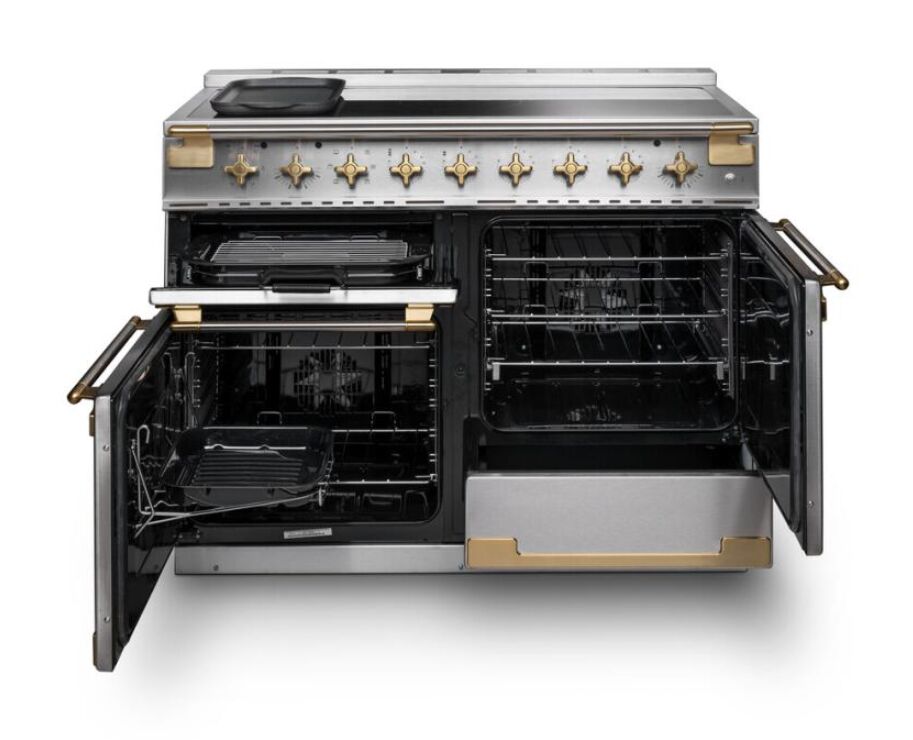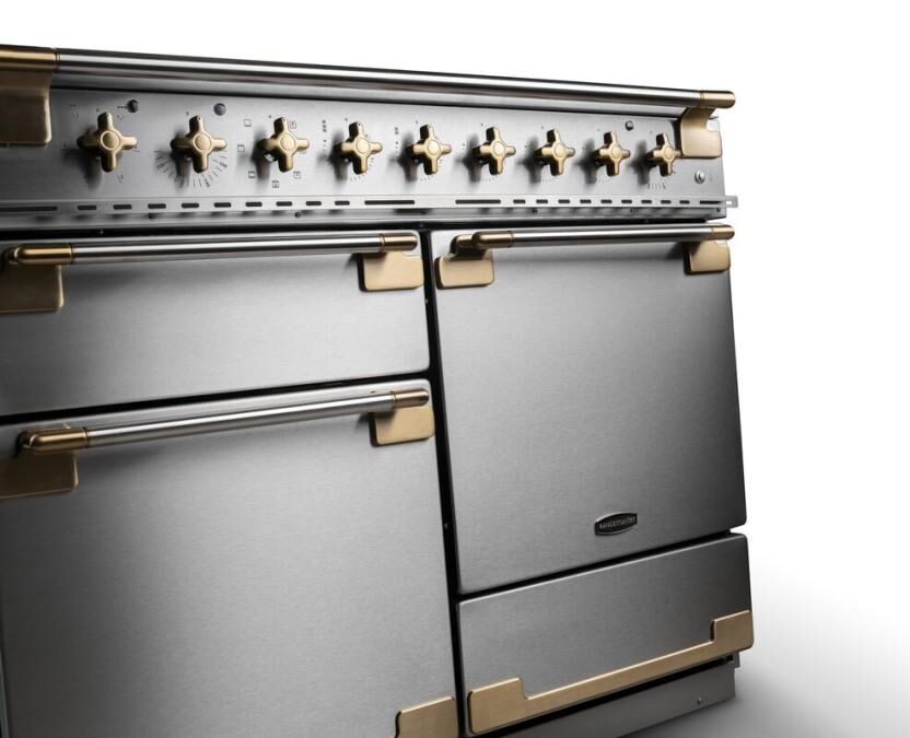 • 110cm wide dual fuel range cooker with a premium stainless steel and antique brass finish