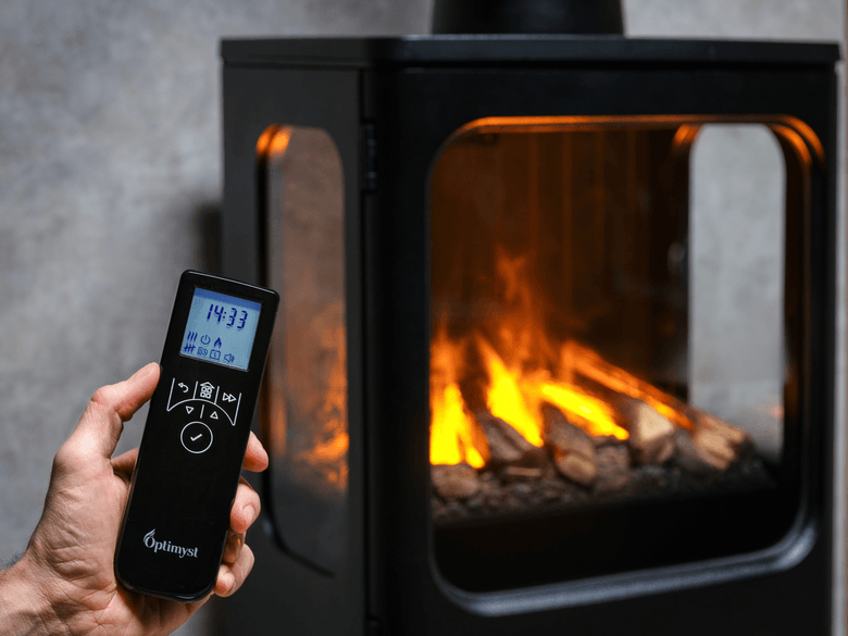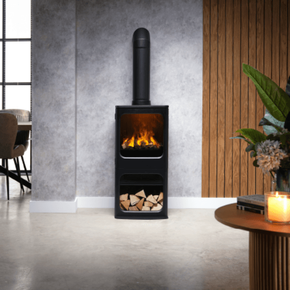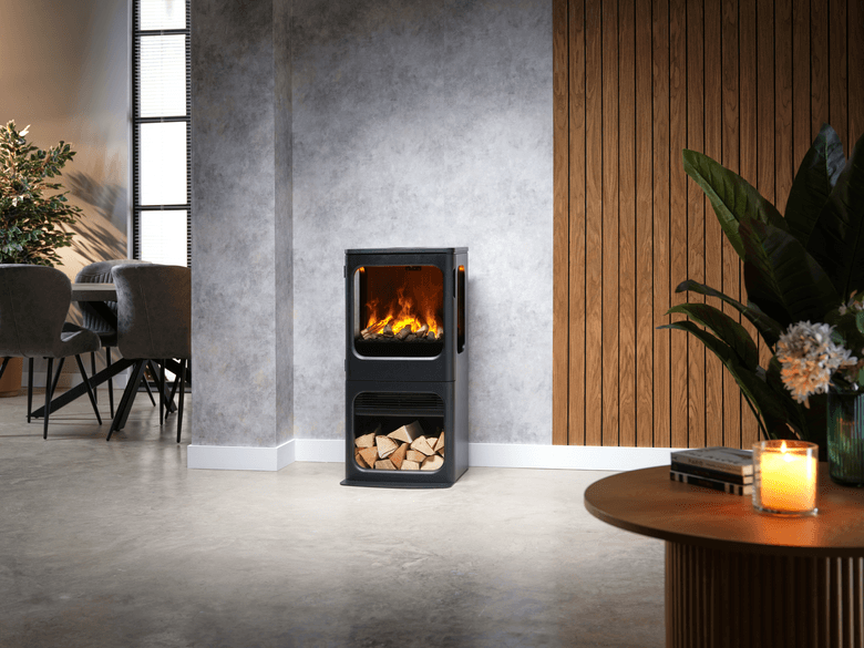 The Mapleton 100 with log store combines a classic cast-iron and steel design with advanced Optimyst technology to bring the charm of a traditional wood-burning stove into any room. It's freestanding design and generous log store make it both practical and stylish, while panoramic glass panels showcase the realistic flames and logs from multiple angles. Complete with gentle crackling sounds and heat, it creates a warm, immersive ambience with all the convience of modern electric heating.