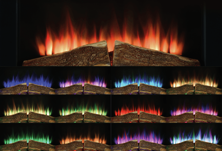 Optiflame technology, calming flames above the a colourful glow bed.
