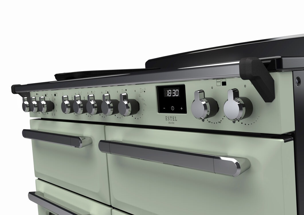 The Estel Deluxe range cooker embodies a classic and timeless aesthetic, blending retro and traditional elements with clean geometric lines and signature chamfered edges. Its design is inspired by utility and durability, offering a practical yet stylish option for those who value timeless functionality. The unique control dials and handles feature a chunky yet ergonomic design that enhances the nostalgic look, perfectly suited to traditional and modern kitchen design in a choice of eight colours, from pastel hues to classic neutral shades.