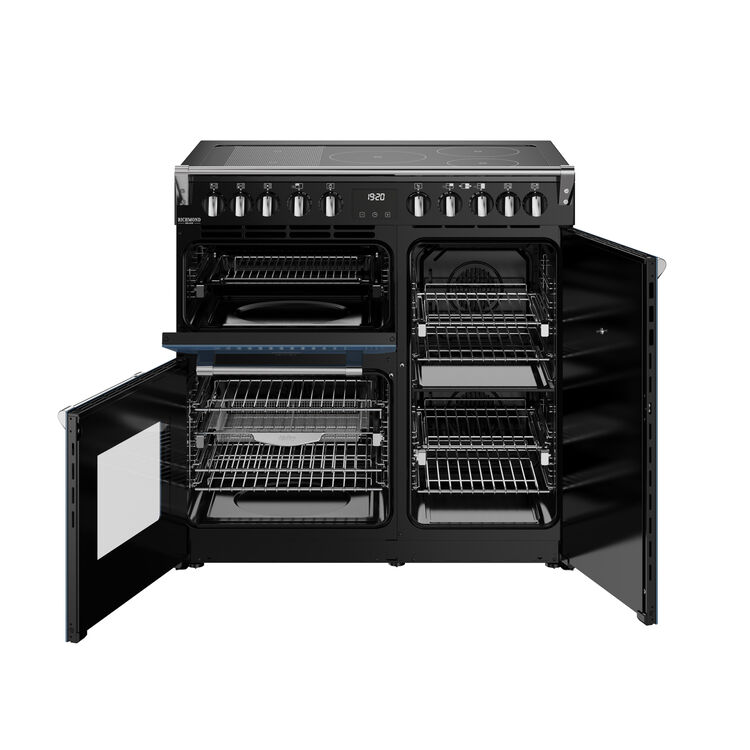 90cm Electric induction range cooker with a 5 zone induction hob, conventional oven & grill, multifunction main oven with TrueTemp™ digital thermostat, and tall fanned oven with PROFLEX™