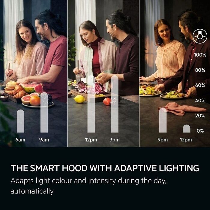 AuroraTech® automatically adapts the colour and intensity of your cooker hood's light according to the time of day to create the perfect kitchen ambience and enhance your comfort. Use the app for the smart illumination experience.