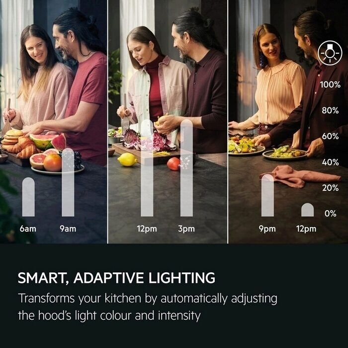 AuroraTech® automatically adapts the colour and intensity of your cooker hood's light according to the time of day to create the perfect kitchen ambience and enhance your comfort. Use the app for the smart illumination experience.