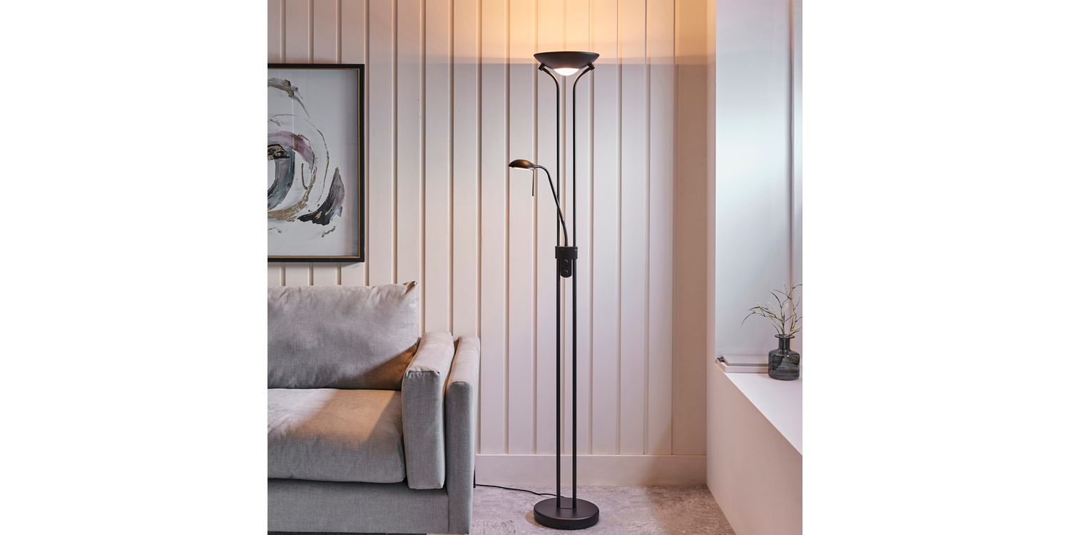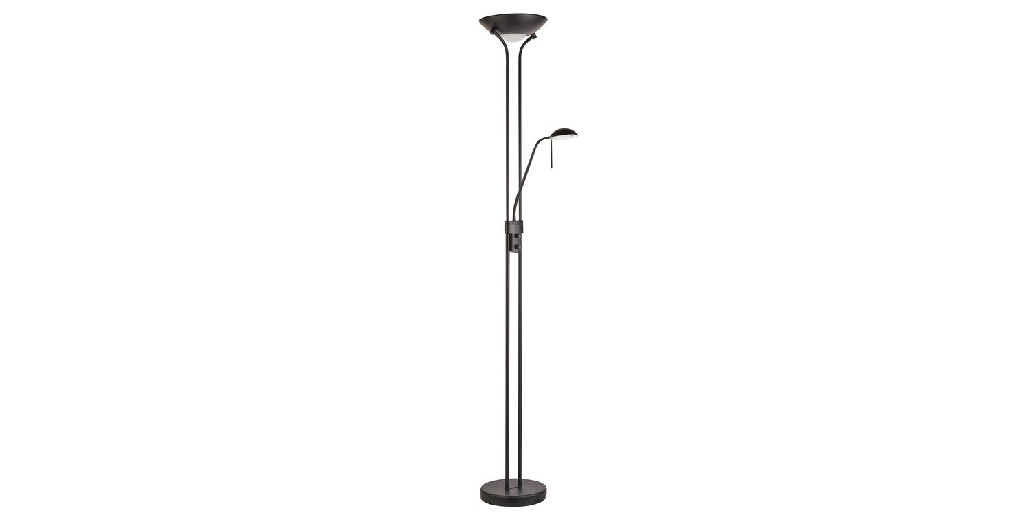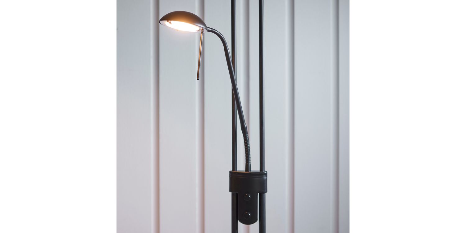 A tall 2 light floor lamp with a double stand supporting an uplighter as well as an adjustable branch holding a reading lamp. Modern black chrome finished metalwork with a opal glass diffuser, complete with an easy to reach double rotary dimmer switch. Compatible to use with LED and halogen lamps. Other colour options available