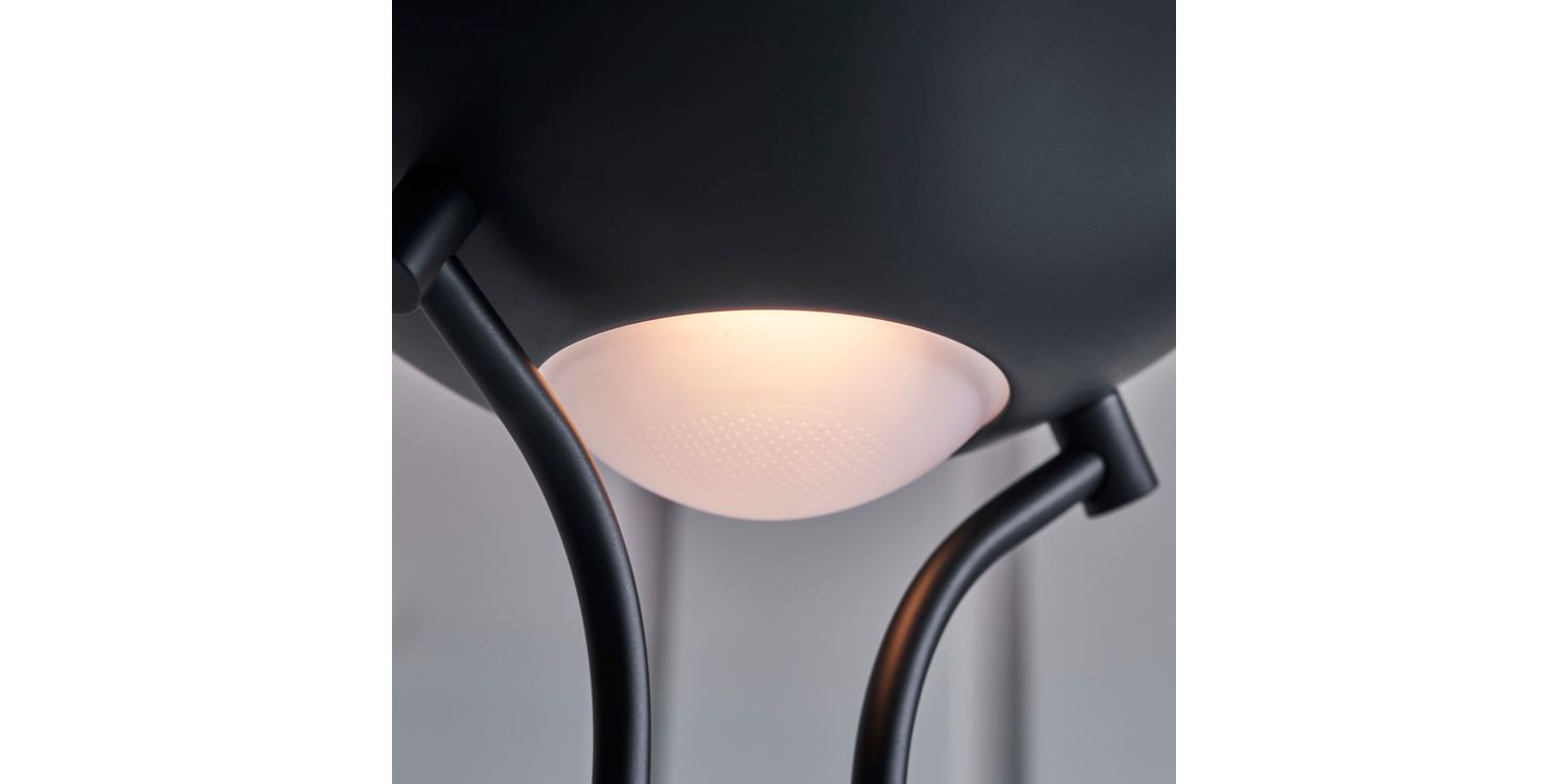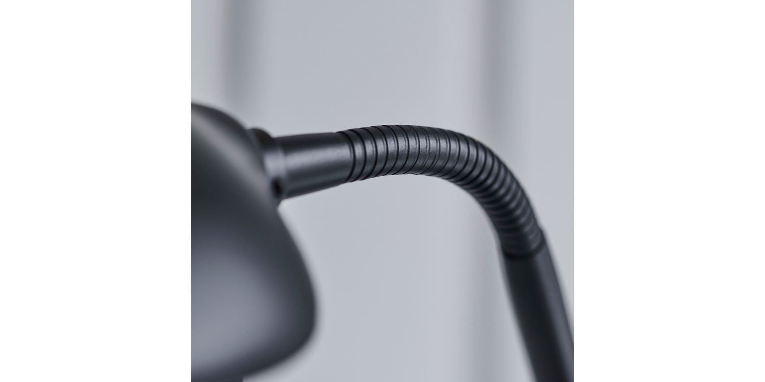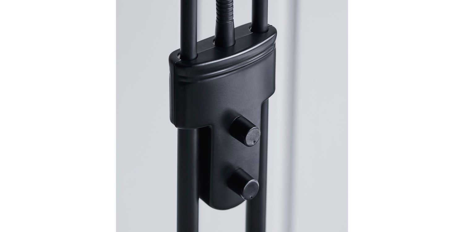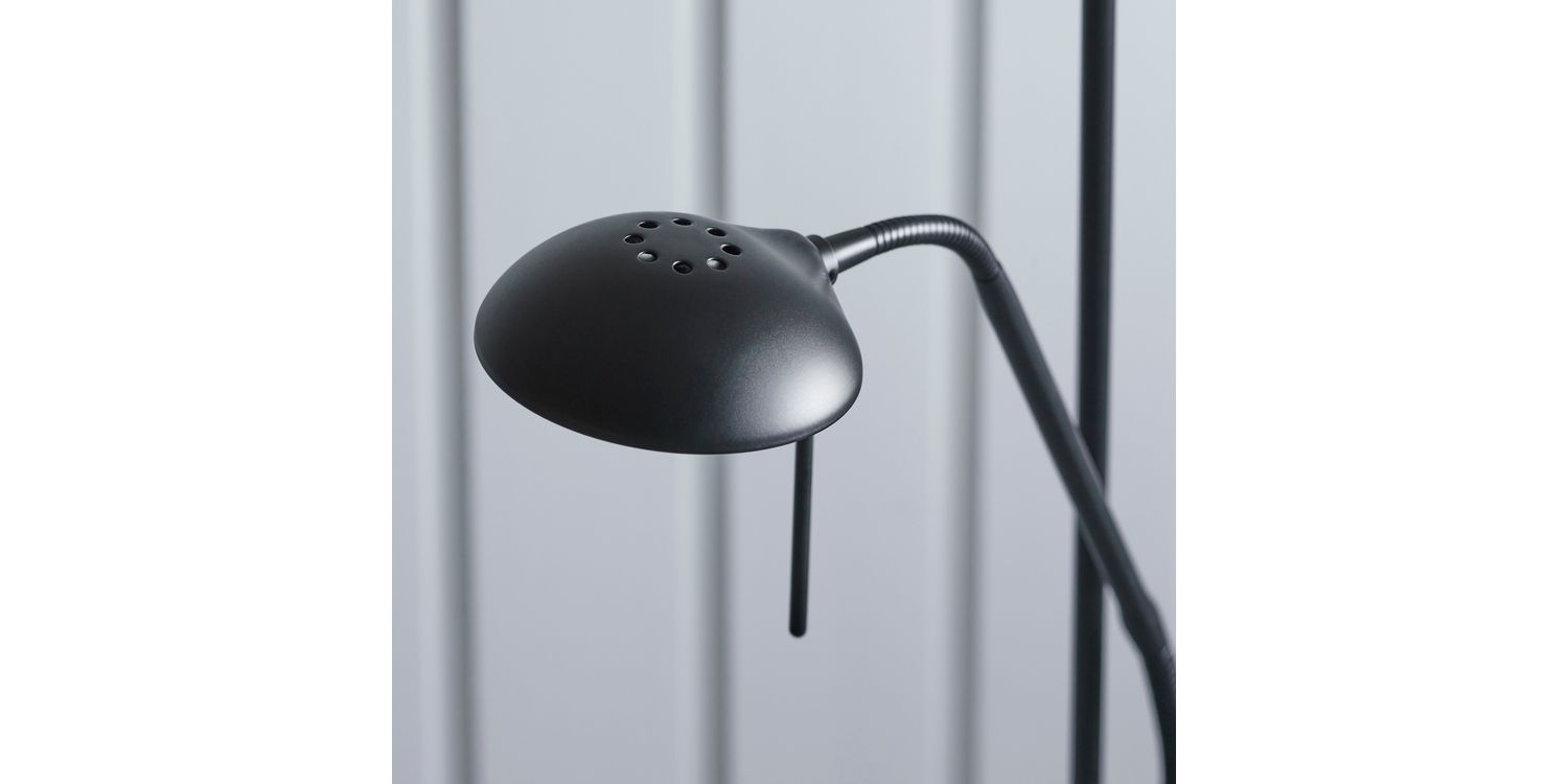 A tall 2 light floor lamp with a double stand supporting an uplighter as well as an adjustable branch holding a reading lamp. Modern black chrome finished metalwork with a opal glass diffuser, complete with an easy to reach double rotary dimmer switch. Compatible to use with LED and halogen lamps. Other colour options available