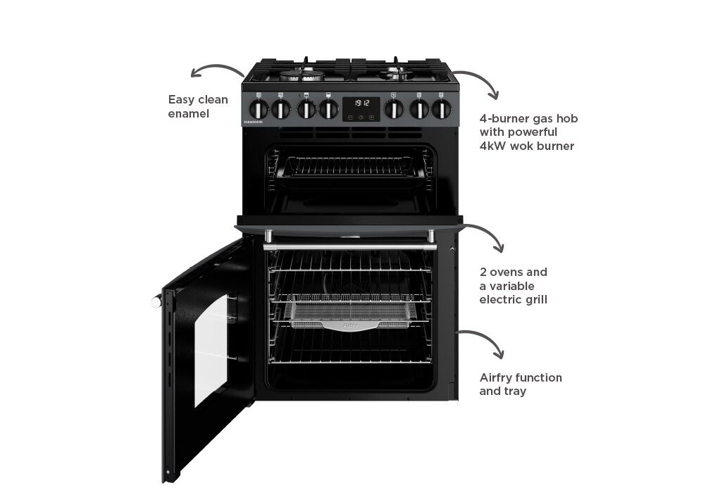 Including two ovens with a range of clever functions including AirFry, a variable electric grill with a full width pan, 4 burner gas hob with a 4K wok burner, plus Easy-Clean enamel oven liner to take the elbow grease out of cleaning.