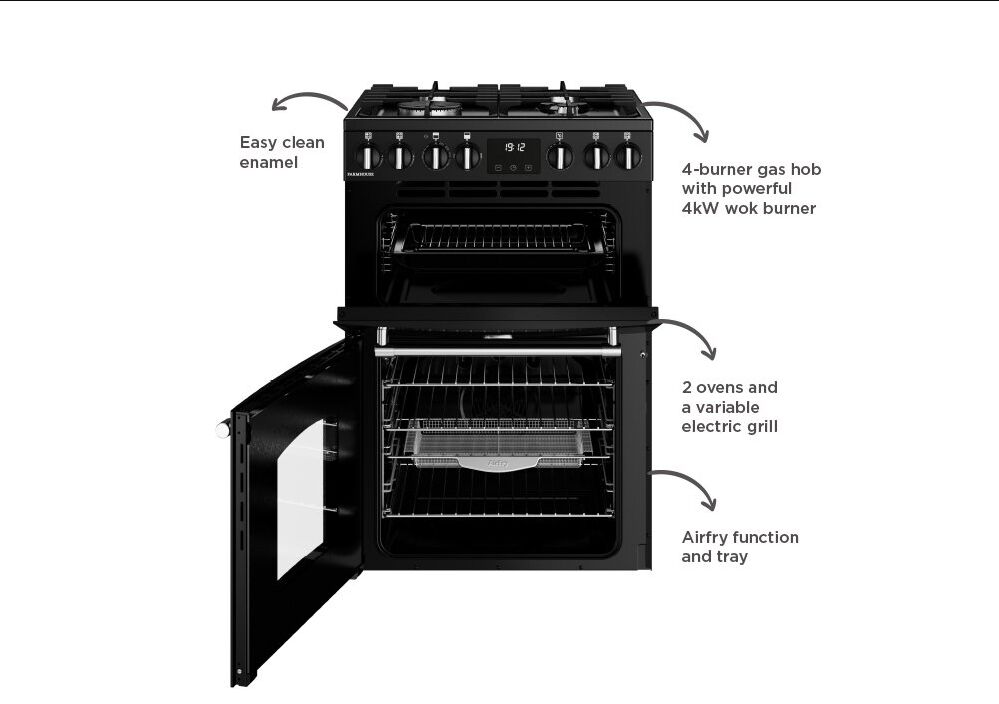 Including two ovens with a range of clever functions including AirFry, a variable electric grill with a full width pan, 4 burner gas hob with a 4K wok burner, plus Easy-Clean enamel oven liner to take the elbow grease out of cleaning.