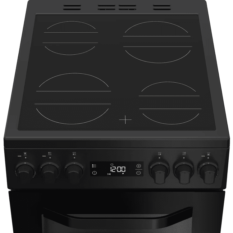 This Hotpoint freestanding 50x60 double cooker features: 4 radiant plates. Black colour. Electric power supply. 50cm width.