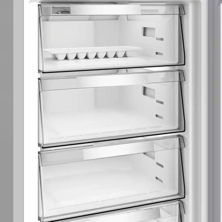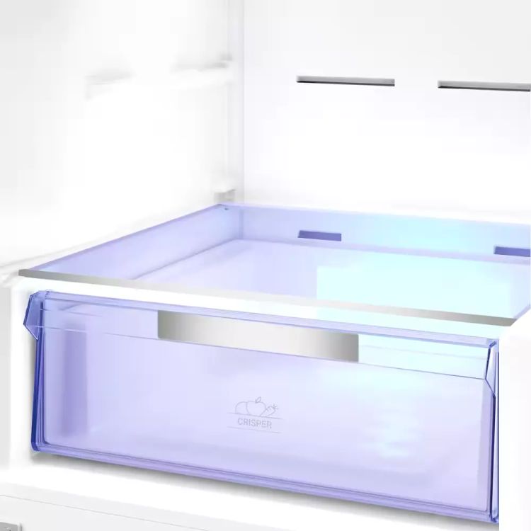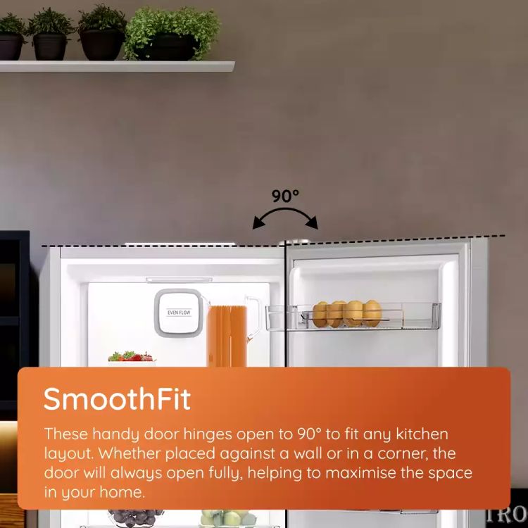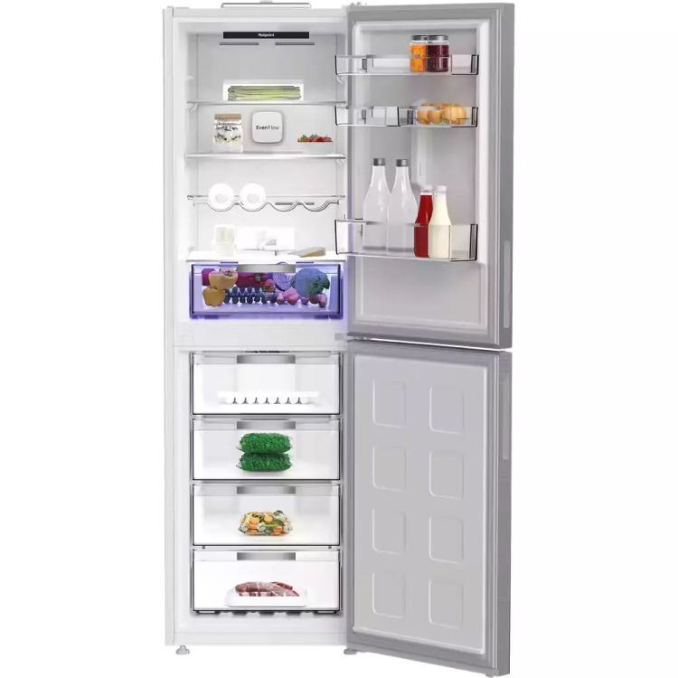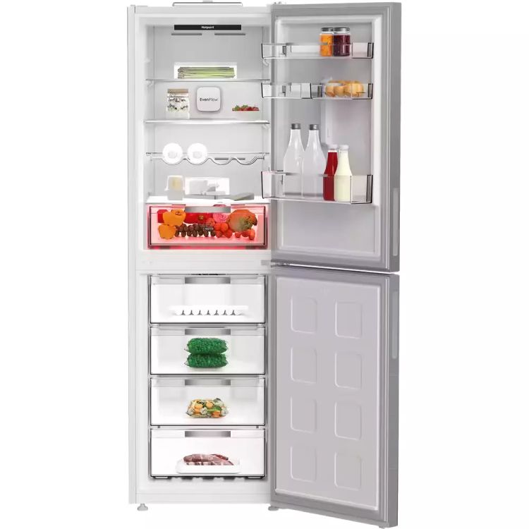 This freestanding Hotpoint fridge freezer offers a balanced 50/50 split between fridge and freezer space, making it a brilliant choice for busy households. With a generous 317L capacity ° enough for 17 shopping bags ° it°s perfect for fitting in your weekly shop with room to spare. Finished in brushed silver and featuring an intuitive touchscreen display, it adds a modern, stylish touch to any kitchen. Clever technology works hard behind the scenes to keep your food fresher for longer and help reduce waste. Dual No Frost circulates cool air evenly through both compartments, helping to prevent ice and moisture build-up. Plus, the quiet, durable Inverter Compressor quickly restores the perfect temperature when the door is opened, helping maintain freshness while keeping energy bills in check. Inside the fridge, Even Flow technology gently distributes consistent, cool air across every shelf, maintaining a stable temperature that keeps your food crisp and flavourful for up to 30% longer*. The dedicated VitalCare drawer also brings a little bit of natural light into your fridge, helping to keep your fruit and vegetables fresh, full of nutrients, and rich in antioxidants for up to 7 days**. The freezer is just as thoughtful, with a Fast Freeze function that rapidly drops the temperature to lock in freshness the moment you unpack your groceries. Even the little details are designed with real life in mind ° like 90° door hinges that make it easy to place the fridge freezer in tight corners or against walls without compromising on access. And when you°re away, Holiday Mode keeps your fridge freezer running efficiently to help save on energy. *Weight loss and sensory evaluation tests used for the determination of shelf life were conducted internally by Beko Corporate on carrot, fresh-cut iceberg lettuce, fresh-cut tomato, strawberry, salami, and kashar cheese samples stored in the EvenFlow refrigerator and control refrigerator (without the EvenFlow technology) for a 12-day period. Actual results may vary based on food type and usage conditions. **Tested by Intertek for fruits and vegetables (blueberry, yellow pepper, tomato, parsley) directly exposed to the light technology compared to a refrigerator without the same technology installed (and compared to Day 0) over a 7-day period while preserved in the crisper.