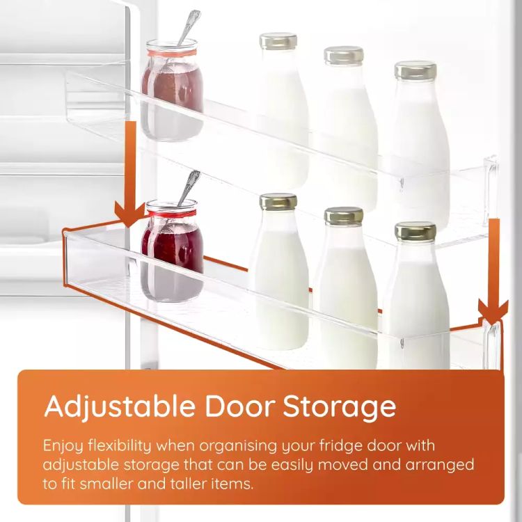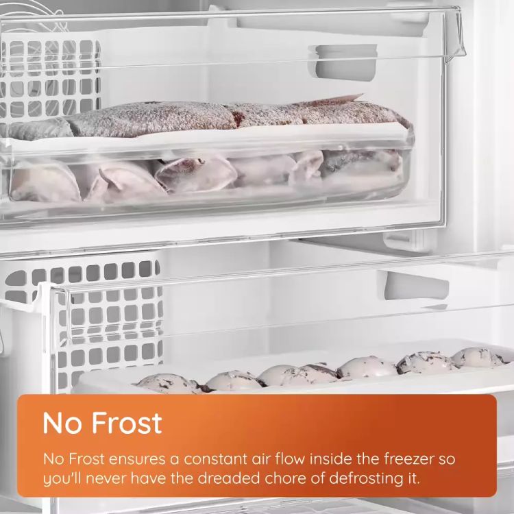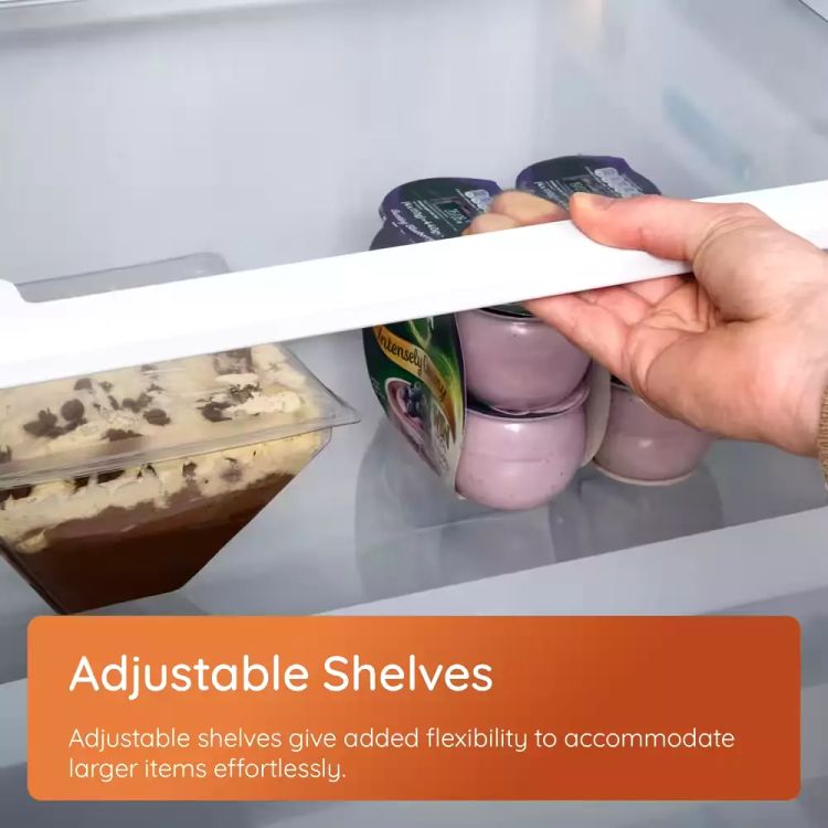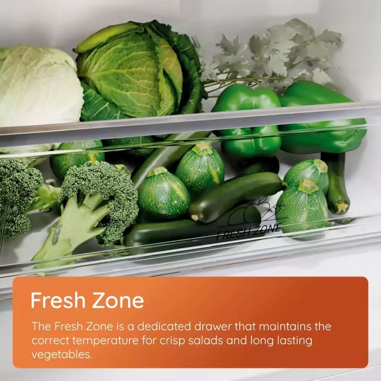 This Hotpoint freestanding fridge freezer offers a 50/50 split of fridge and freezer space and includes thoughtful technology focused on keeping your food fresh and reducing waste. Available in classic white, it has a generous capacity of 270L, which is ample space for 15 shopping bags of groceries - perfect for the weekly shop. Inside the freezer compartment, our intelligent No Frost technology delivers constant airflow so you'll never need to spend time defrosting. Inside the fridge compartment, you'll find a dedicated Fresh Zone drawer that maintains the ideal temperature to keep salads crisp and vegetables fresher for longer. Plus, adjustable shelves and door storage allow you to accommodate larger items effortlessly - perfect for large bottles and unexpected leftovers - and bright LED lights illuminate the interior of your fridge so you can see everything clearly. Our reversible door design also gives you the flexibility to choose whether the door opens from the left or the right.