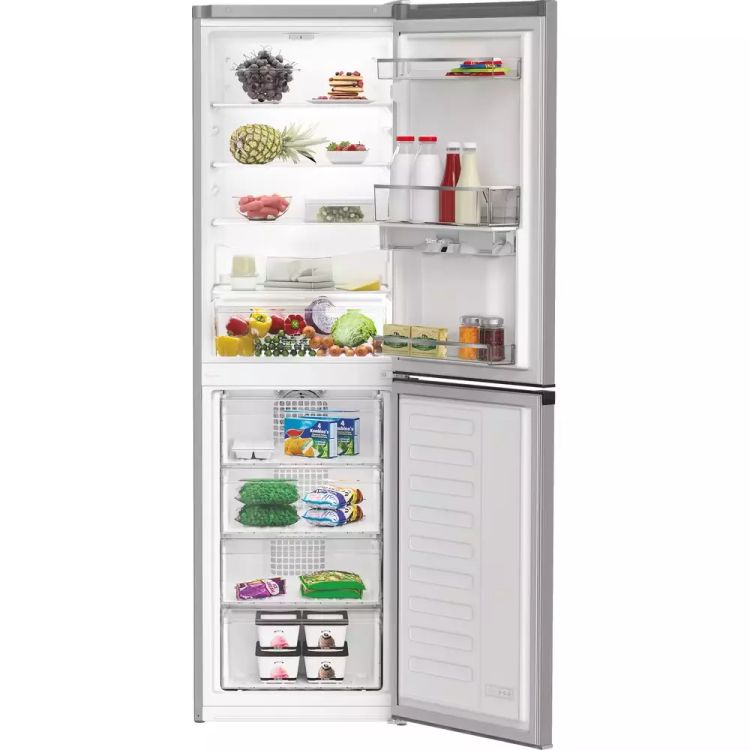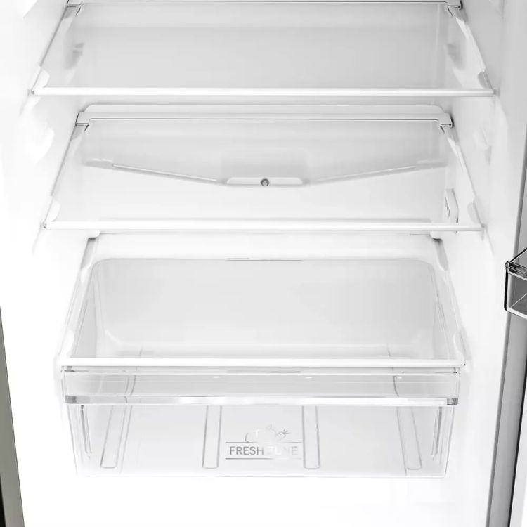 This Hotpoint freestanding 50/50 fridge freezer in stylish silver features thoughtful technology that keeps your food fresh and prevents waste. With a spacious capacity of 270L, it provides ample space for 15 shopping bags, so you can easily fit all your groceries in. Our clever No Frost technology ensures a constant airflow inside the freezer, so you'll never have the dreaded chore of defrosting it. Inside you'll find a dedicated Fresh Zone drawer, which maintains the correct temperature for crisp salad and long-lasting vegetables, while adjustable shelves give added flexibility to accommodate larger items effortlessly. Bright LED lighting illuminates the interior of your fridge so you can see everything clearly, and the reversible door design lets you position it perfectly in your space. Outside, the integrated water dispenser lets you quench your thirst instantly with quick and easy access to chilled water.