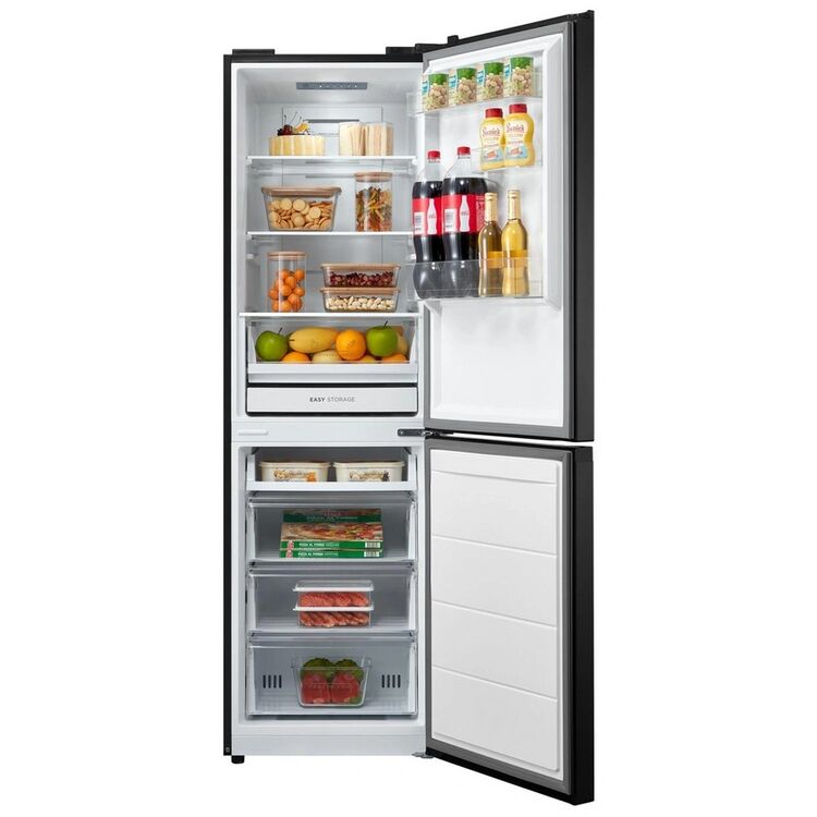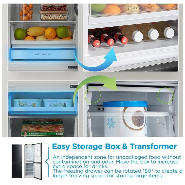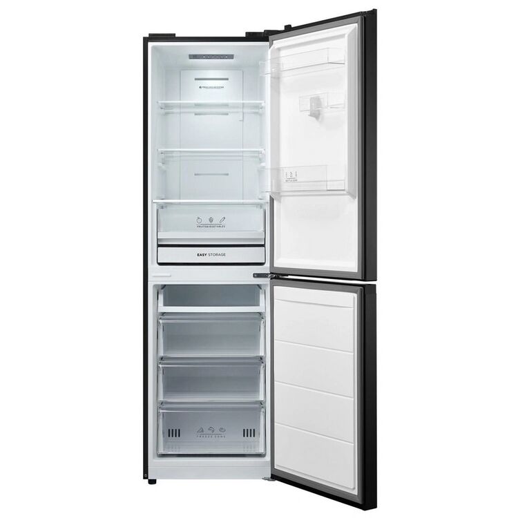 Discover the Midea MDRB379FGD30 fridge freezer, featuring a 60/40 split and Total No Frost technology that eliminates the need for manual defrosting. Designed with a 54.7cm width, this model fits conveniently into compact kitchens while offering ample storage with its Transformer Drawer and Easy Storage Fridge Drawer. The sleek black finish adds a modern touch to your home.