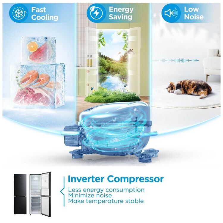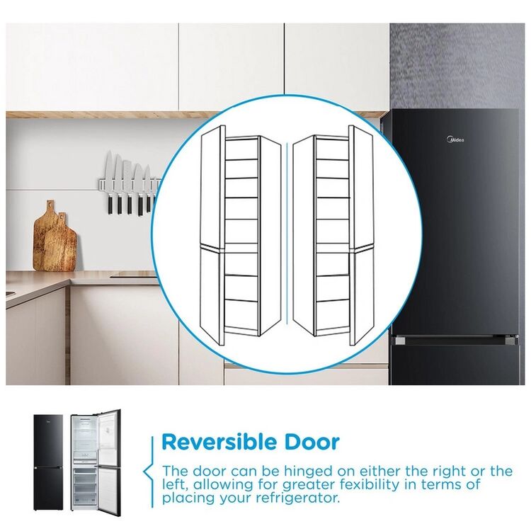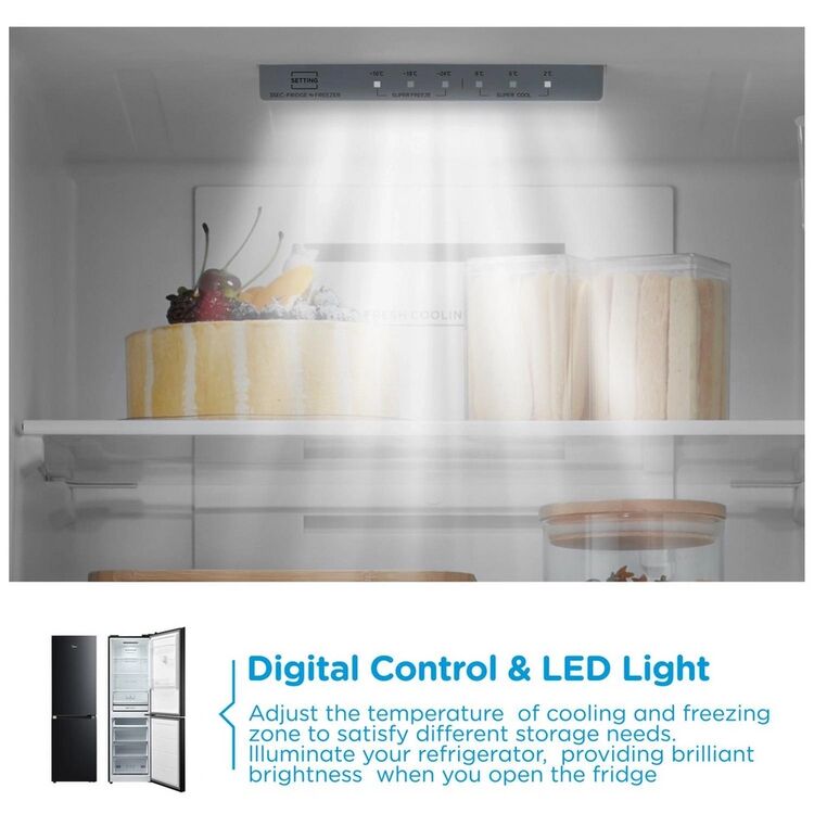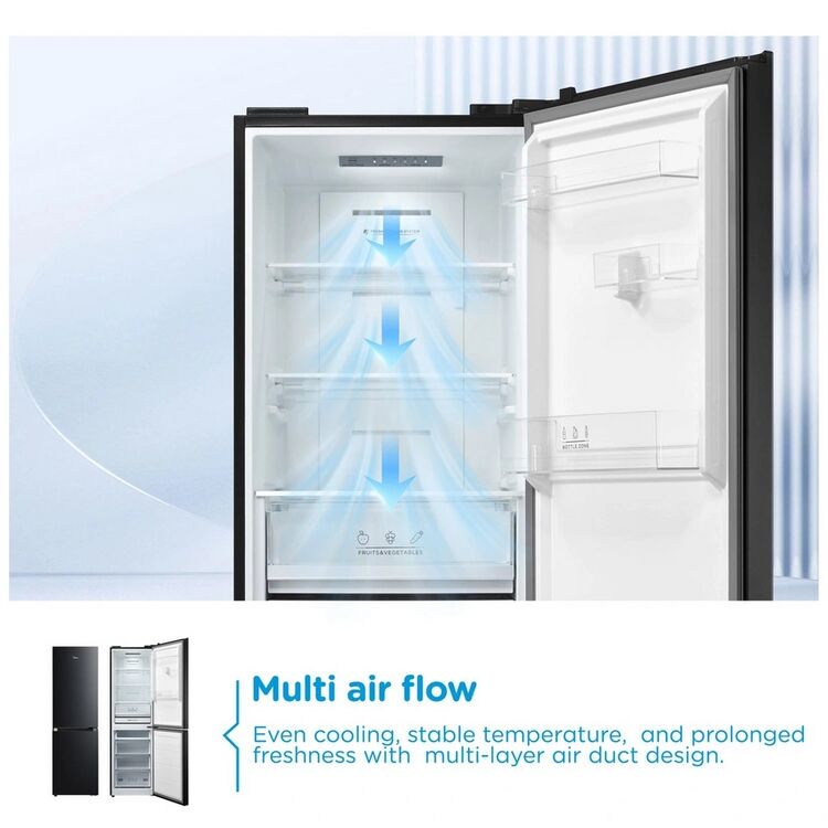 Compliant with a D Class energy rating, the Midea MDRB379FGD30 ensures energy-conscious operation without sacrificing performance. Its Total No Frost system promotes consistent temperature and prevents ice build-up, reducing maintenance efforts. Choose this reliable fridge freezer for practical daily use and a streamlined kitchen experience.