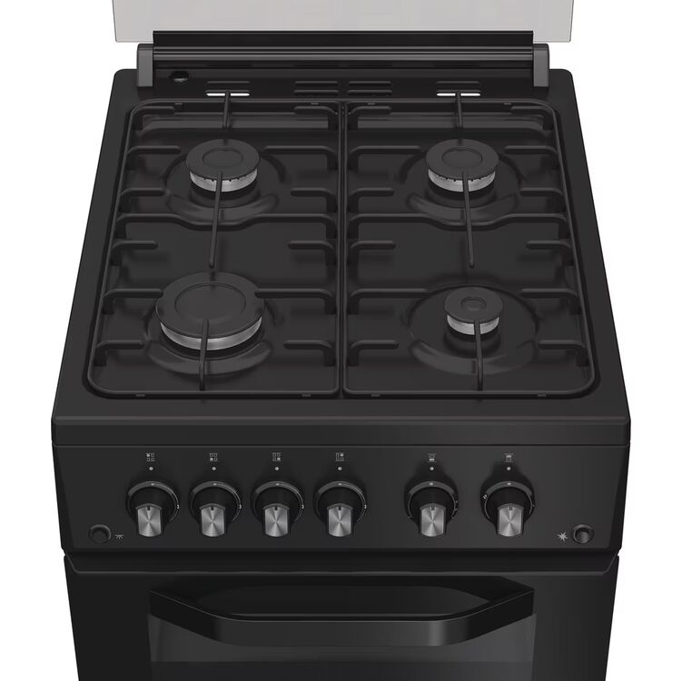 This Hotpoint freestanding 50x60 double cooker features: 4 gas burners. Black colour. Gas power supply. 50cm width.