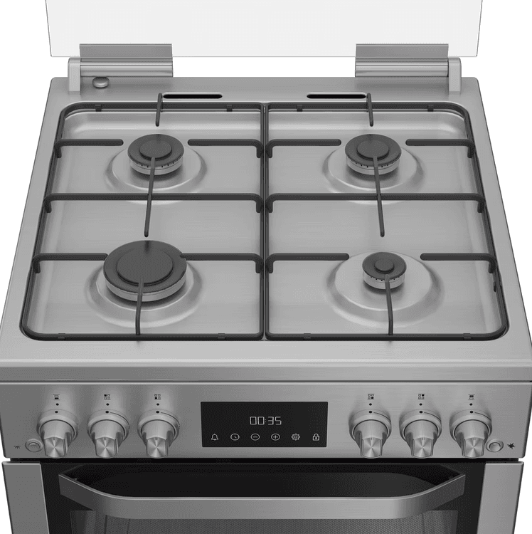 This Hotpoint freestanding 60x60 double cooker features: 4 gas burners. Inox colour. Gas power supply. 60cm width.