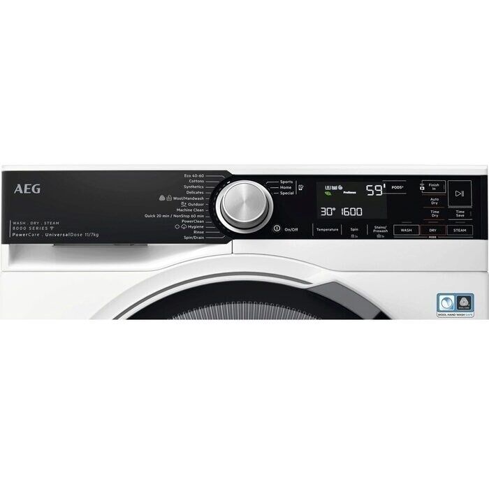 The AEG 8000 PowerCare Washer Dryer uses pre-mixing technology to activate detergent power, offering superior washing results even at 30°C in 49 minutes. Items are dried, not overdried, helping to keep their look and feel.
