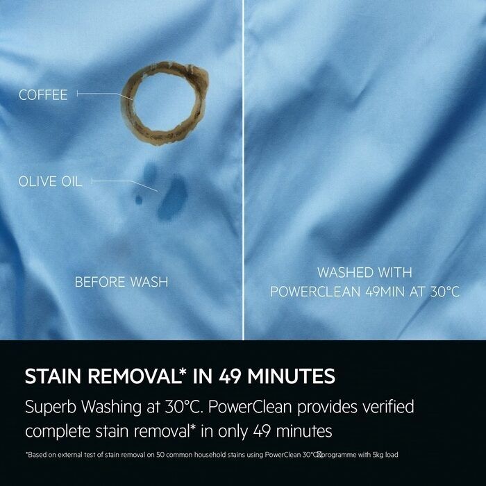 PowerClean delivers ideal laundry results using pre-mixing technology to ensure detergent is evenly distributed on each item. This provides proven, complete stain removal at 30°C and in just 49 minutes.* It also adjusts drying time according to load size.