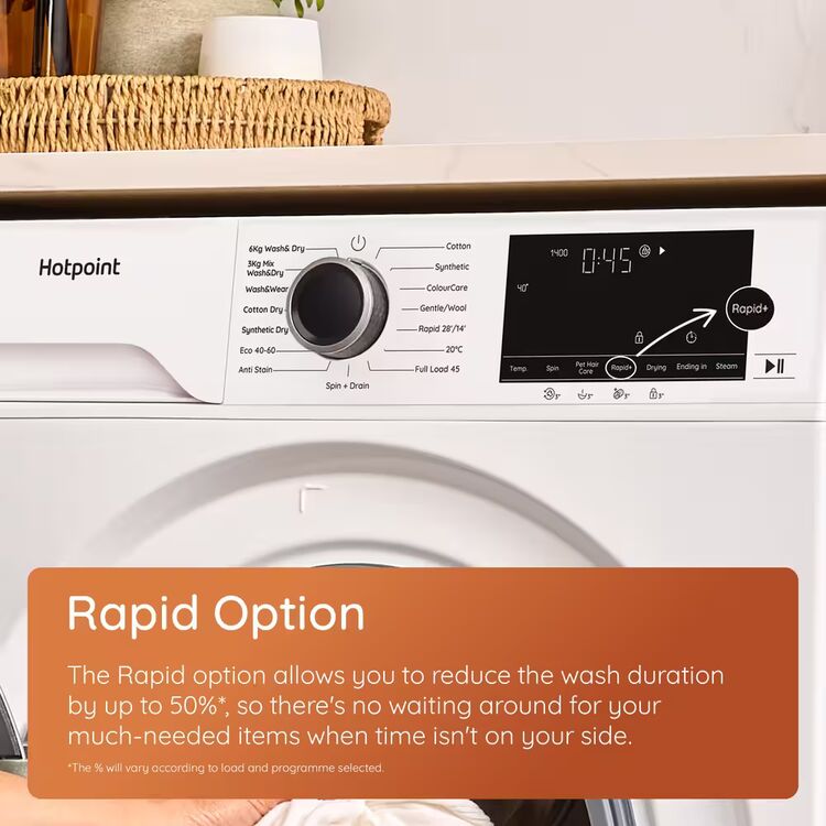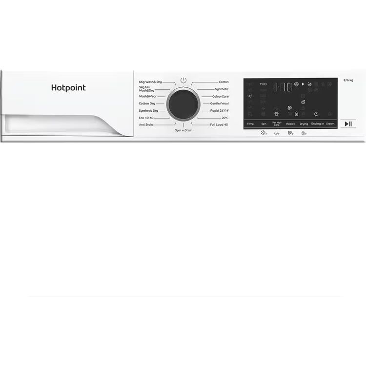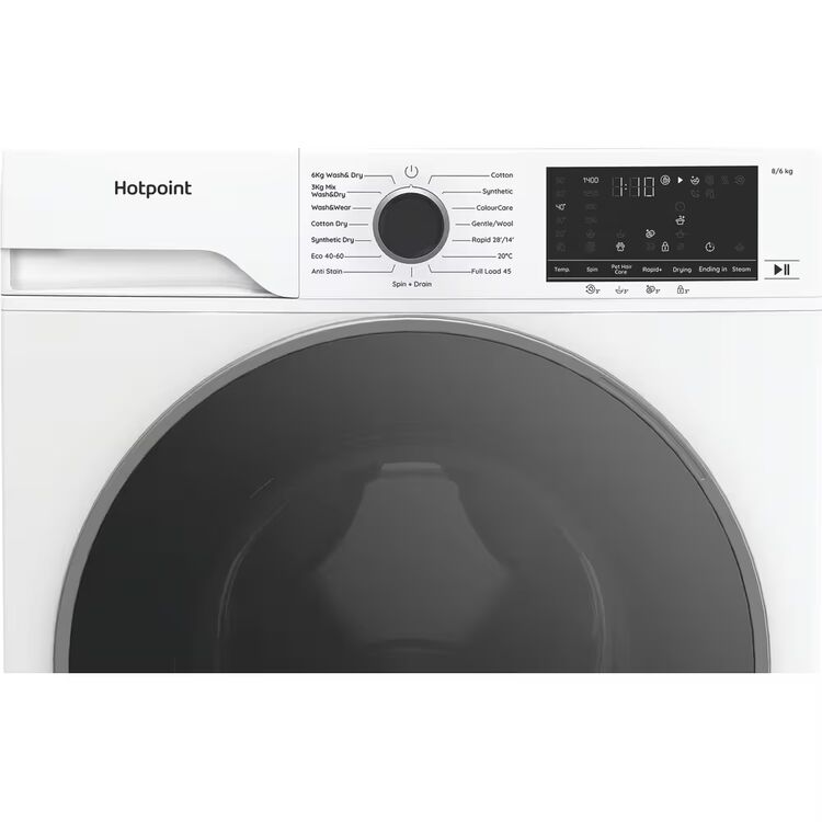 This Hotpoint freestanding Washer Dryer features: outstanding 8kg washing capacity. Spacious 6kg drying capacity. A fast, resource-efficient 1400 revolutions per minute spin speed. White colour.