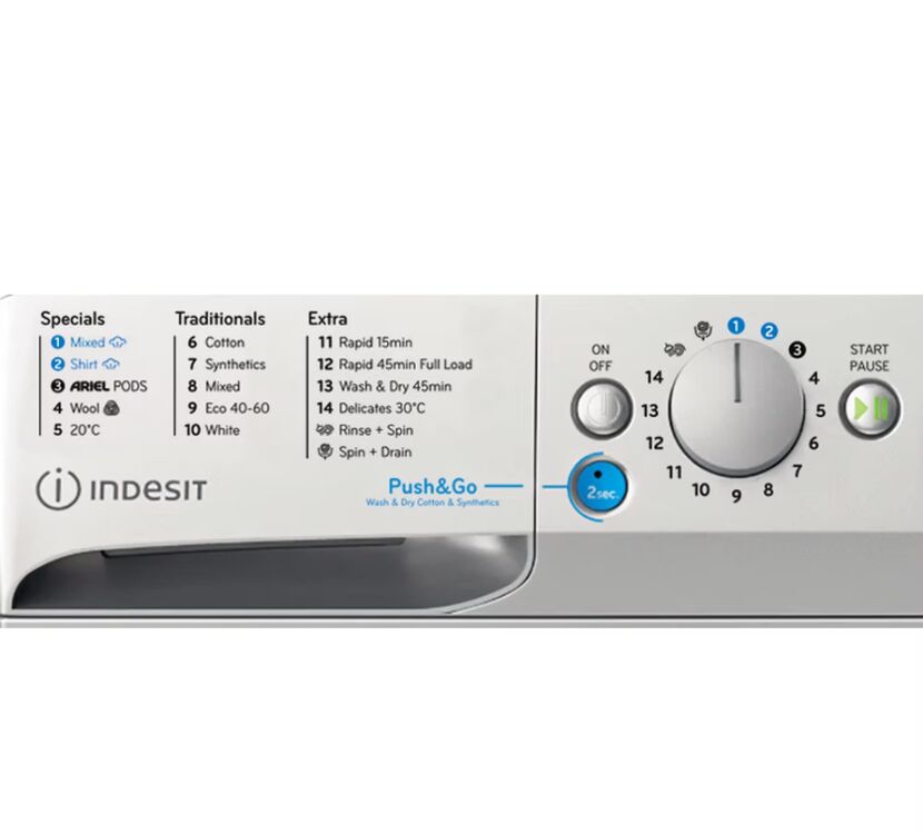 This Indesit freestanding Washer Dryer features a spacious 9kg washing capacity and a 6,0kg drying capacity and a fast, resource-efficient, 1400 revolutions per minute spin speed. With Push&Go washer dryers, the whole family can help with the housework - simply press the blue button for two seconds to start a daily cycle.