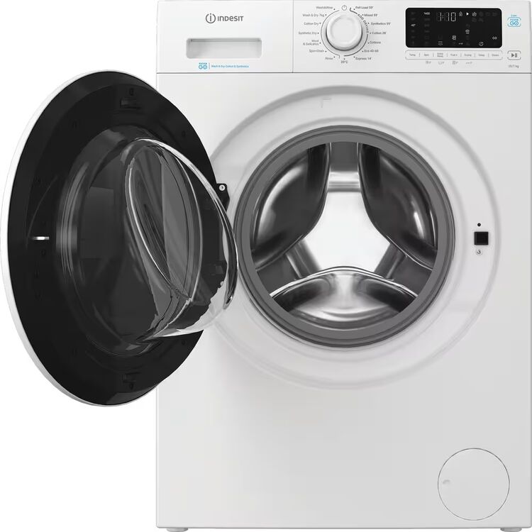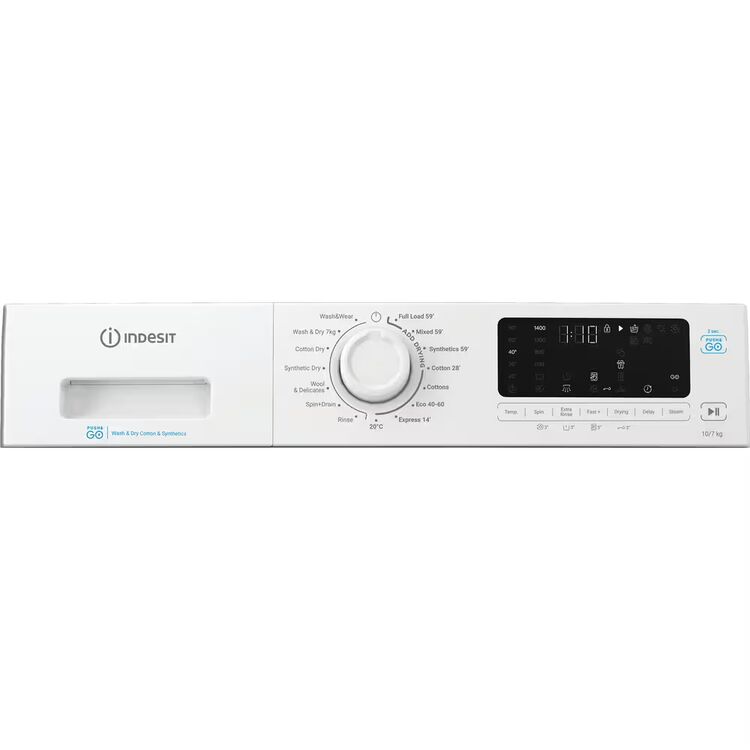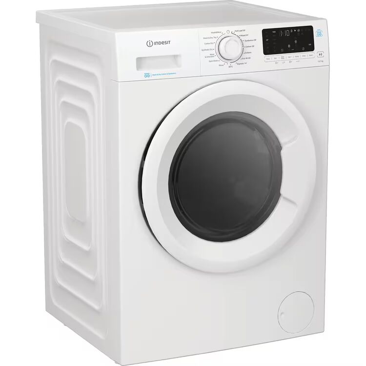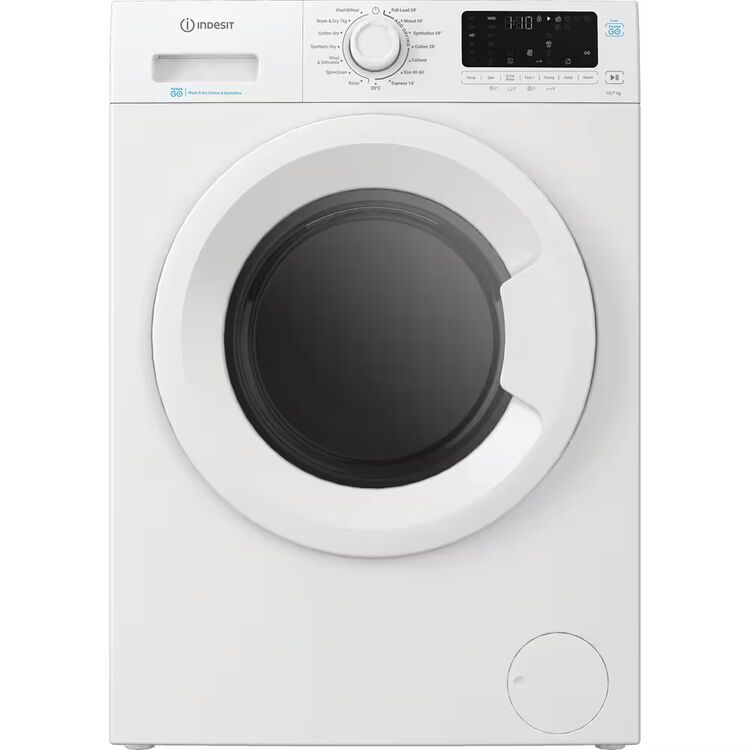 This Indesit freestanding Washer Dryer features: outstanding 10kg washing capacity. Spacious 7kg drying capacity. A fast, resource-efficient 1400 revolutions per minute spin speed. White colour.