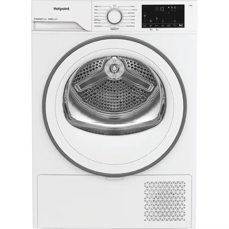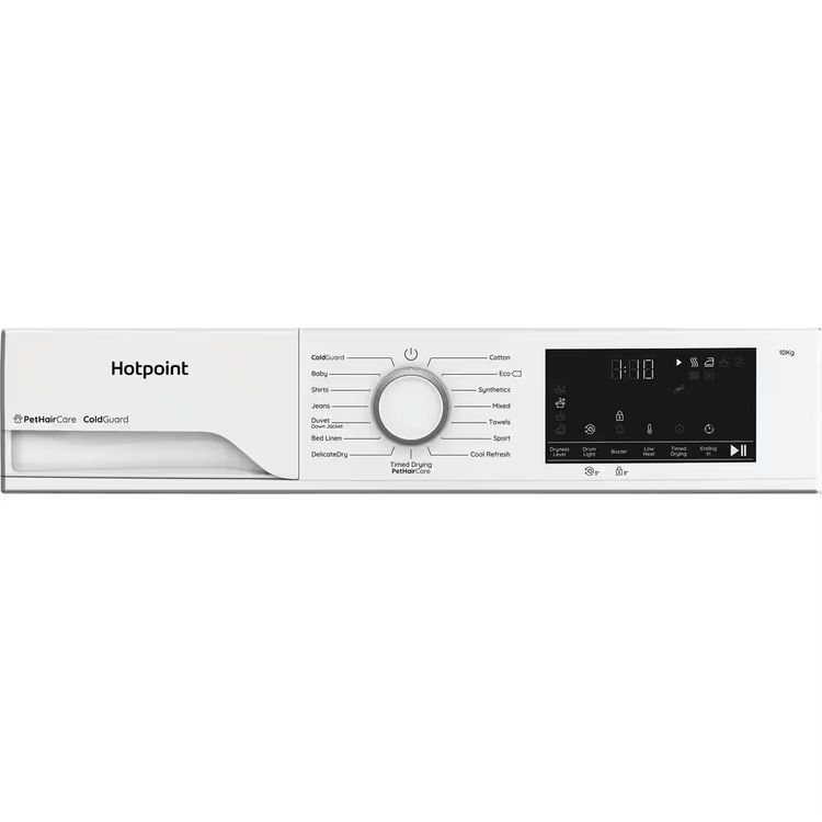 This white Hotpoint heat pump tumble dryer is thoughtfully designed to handle busy family life. With an extra large 10kg capacity, big laundry loads are tackled effortlessly. It uses Heat Pump technology to gently dry clothes at lower temperatures ° protecting fabrics and helping you use up to 77% less energy*. Love your pets but not the hair they leave behind? The PetHairCare cycle relaxes fibres and reduces static with a burst of steam, helping to lift away hair so it ends up in the filter, not on your clean laundry. With DelicateDry the finer things in your wardrobe are looked after, gently drying at a lower temperature to help stop shrinkage and keep clothes in great shape. Maintenance is quick and easy too, with a combined easy-clean lint and condenser filter in the door. And if space indoors is limited ColdGuard programme works efficiently in colder spaces down to 0°C ° perfect for garages and outbuildings. *Compared to condenser tumble dryers of B energy class.