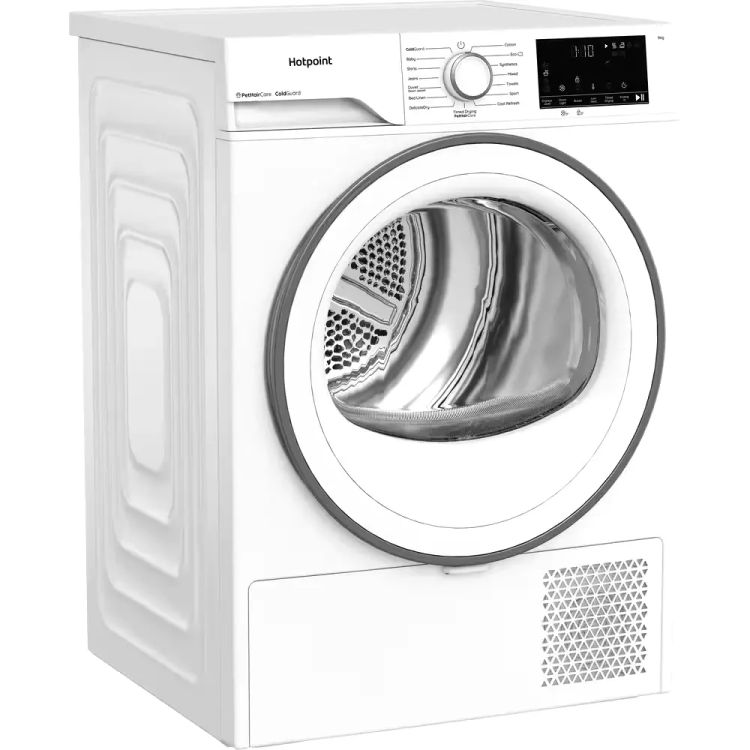 This classic white Hotpoint heat pump tumble dryer makes laundry day easy. With a spacious 9kg drum, you can dry more in one go, making it perfect for busy homes. Thanks to Heat Pump technology, it uses up to 77% less energy* while drying clothes gently at lower temperatures ° great for delicate items and your bills. If pets are part of your family, the PetHairCare cycle will help. Steam relaxes fabrics to lift hair and trap it in the filter, so clothes come out fresh and hair-free. The DelicateDry cycle dries gently at lower temperatures ° helping prevent shrinking and keeping your favourite pieces looking good as new.