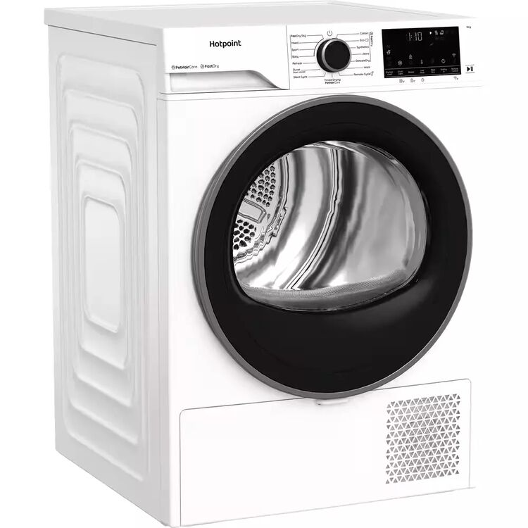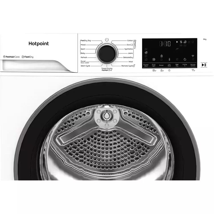 Look after your family's laundry with this energy-efficient Hotpoint heat pump tumble dryer in classic white. With a generous 9kg drum, it°s perfect for getting through laundry days without any fuss.