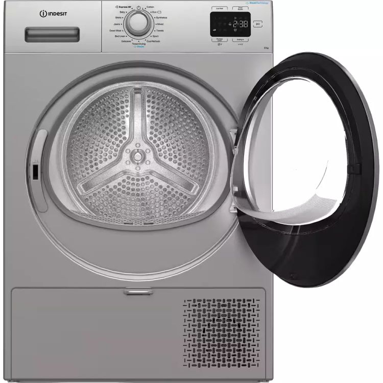 Dry your clothes the easy way with this stylish silver Indesit heat pump dryer. The large 8kg drum means fewer loads and more free time to do what you love.