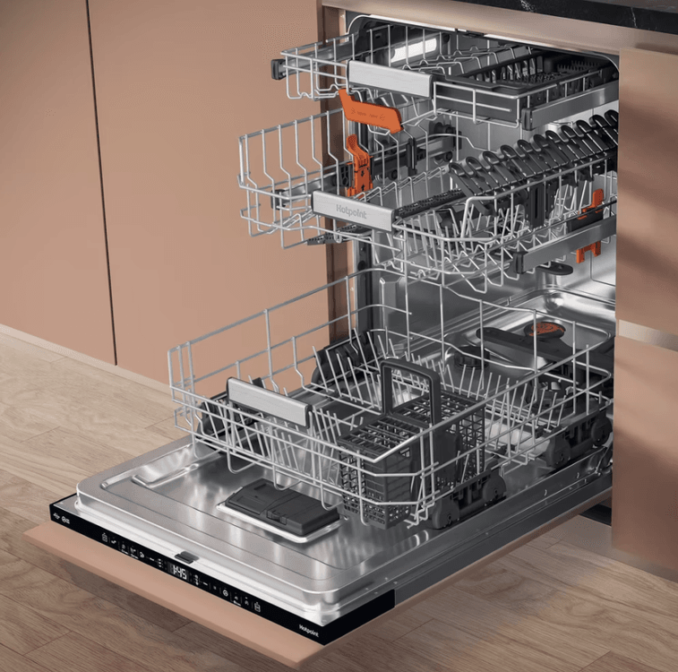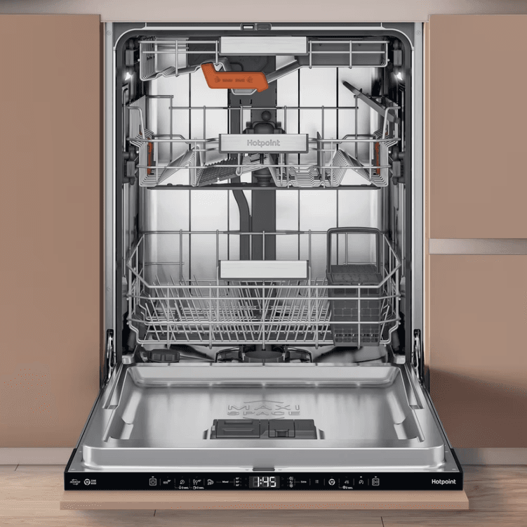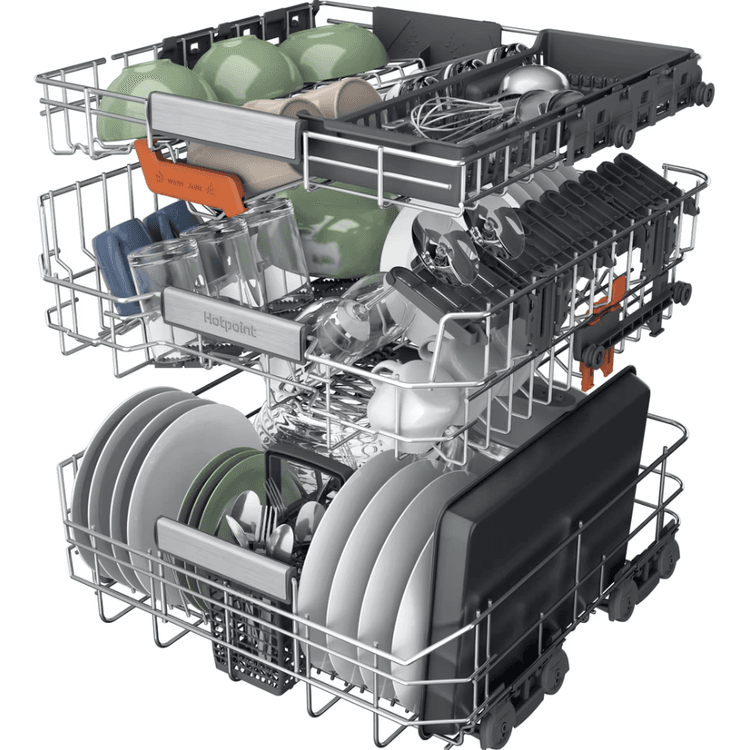 This dishwasher with Maxi Space tub means you get 10%*** more usable space, so you can load even mugs and small dishes into the top rack so not matter what's been on the menu today, you can count on Hotpoint to get your tableware spotless.